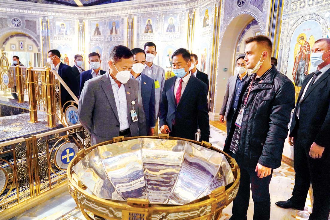 ဦးစွာ နိုင်ငံတော်စီမံအုပ်ချုပ်ရေးကောင်စီ ဒုတိယဥက္ကဋ္ဌ၊ ဒုတိယတပ်မတော် ကာကွယ်ရေးဦးစီးချုပ် ကာကွယ်ရေးဦးစီးချုပ် (ကြည်း)နှင့် အဖွဲ့ဝင်များသည် ရုရှားတပ်မတော်၏ ပင်မဘုရားရှိခိုးကျောင်းတော်ကြီးသို့ ရောက်ရှိကြရာ တာဝန်ရှိသူများက ကြိုဆိုနှုတ်ဆက်ကြပြီး ဘုရားရှိခိုးကျောင်းတော်ကြီးအနီးရှိ ပြတိုက်တွင် ဒုတိယကမ္ဘာစစ် ဖြစ်ပွားစဉ်ကာလအတွင်း အသုံးပြု ခဲ့သည့် လက်နက်၊ ခဲယမ်း၊ ချပ်ဝတ်တန်ဆာနှင့် အသုံးအဆောင်ပစ္စည်းများ၊ ဆေးတပ်ဖွဲ့ဆိုင်ရာ အသုံးအဆောင်ပစ္စည်းများ၊ ဆက်သွယ်ရေး အသုံးအဆောင်ပစ္စည်းများနှင့် စစ်ပွဲများ အကြောင်းကို Program များဖြင့် ပြုလုပ်ပြသထားမှုများအား လေ့လာ ကြည့်ရှုကြပြီး သိရှိလိုသည်များကို မေးမြန်းဆွေးနွေးခဲ့ကာ ပင်မဘုရားရှိခိုးကျောင်းတော်ကြီးအတွင်း ဝင်ရောက်၍ သမိုင်းကြောင်း နှင့် မှတ်တမ်းများအား လေ့လာကြည့်ရှုကြသည်။