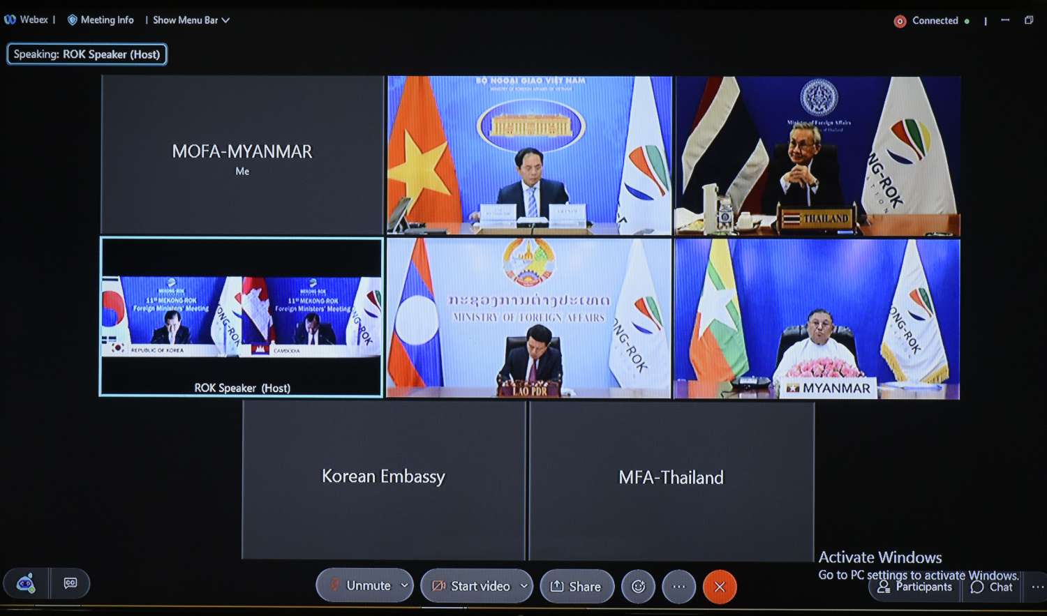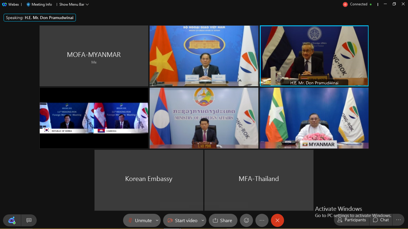 နိုင်ငံခြားရေးဝန်ကြီးဌာန၊ ပြည်ထောင်စုဝန်ကြီး ဦးဝဏ္ဏမောင်လွင်သည် ၂၀၂၁ ခုနှစ်၊ စက်တင်ဘာ လ(၈)ရက်နေ့၊ မွန်းလွဲပိုင်းတွင် ဗီဒီယိုကွန်ဖရင့်စနစ်ဖြင့် ကျင်းပပြုလုပ်သည့် (၁၁)ကြိမ်မြောက် မဲခေါင်-ကိုရီးယားပူးပေါင်းဆောင်ရွက်မှု နိုင်ငံခြားရေးဝန်ကြီးများအစည်းအဝေး (11th Mekong-Korea Cooperation Foreign Ministers Meeting)သို့ နိုင်ငံခြားရေးဝန်ကြီးဌာန၊ နေပြည်တော်မှ ပါဝင်တက်ရောက်ခဲ့သည်။