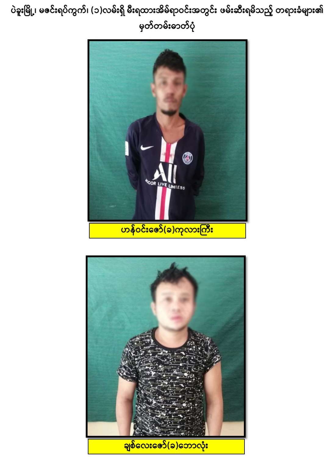 ပဲခူးမြို့နယ်၊ ရန်ကုန်-မန္တလေးလမ်းဟောင်း ဘူးလယ်အင်းကျေးရွာအနီး ဧရာဝတီဘဏ်မှ ငွေသယ်ဆောင်လာသည့် ကား ၂ စီးအား ဓားပြတိုက်သည့် ဖြစ်စဉ်မှ တရားခံများထပ်မံ ဖမ်းဆီးရမိ