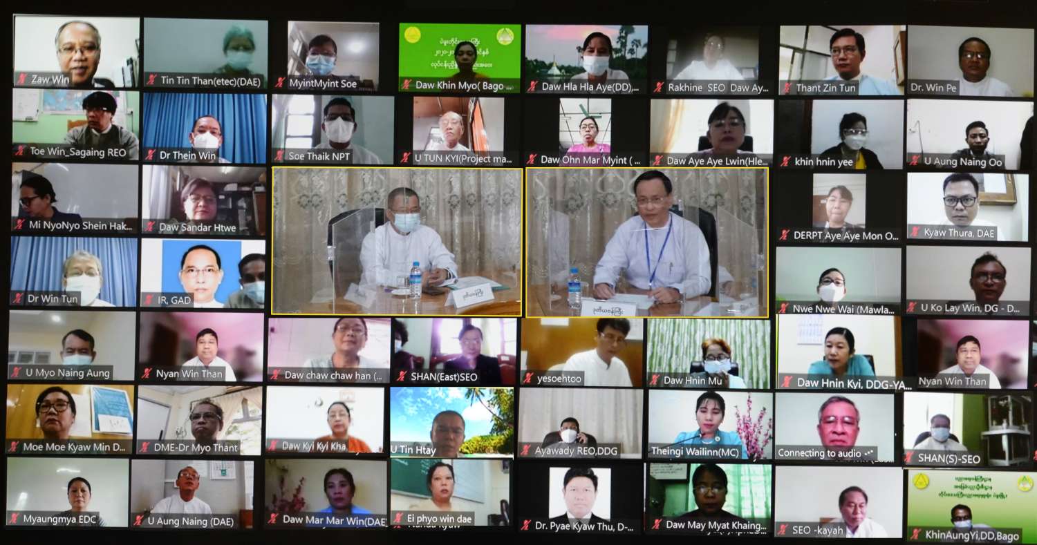 ကျောင်းပြင်ပတစ်သက်တာပညာရေး မိတ်ဖက်ပူးပေါင်းဆောင်ရွက်မှု မူဘောင်နှင့် အရည် အသွေး စံအကဲဖြတ်အညွှန်းဘောင် မိတ်ဆက်ခြင်းအခမ်းအနားကို ယနေ့ နံနက် ၁၀ နာရီတွင် Video Conferencing စနစ်ဖြင့်ကျင်းပရာ ပညာရေးဝန်ကြီးဌာန ဒုတိယဝန်ကြီးများ ဖြစ်ကြသော ဒေါက်တာဇော်မြင့်နှင့်ဦးဇော်ဝင်း၊ ညွှန်ကြားရေးမှူးချုပ်များ၊ ပါမောက္ခချုပ်များ၊ ဒုတိယအမြဲတမ်း အတွင်းဝန်များနှင့် ဒုတိယညွှန်ကြားရေးမှူးချုပ်များ၊ ကျောင်းအုပ်ကြီးများ၊ တိုင်းဒေသကြီးပြည်နယ် ပညာရေးမှူးများ၊ အရပ်ဖက်လူမှုအဖွဲ့အစည်းများမှ ကိုယ်စား လှယ်များနှင့် တာဝန်ရှိ သူများ တက်ရောက်ကြသည်။
