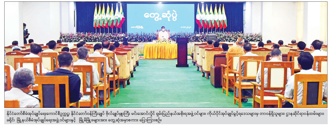 နိုင်ငံတော်စီမံ အုပ်ချုပ်ရေးကောင်စီဥက္ကဋ္ဌ၊ နိုင်ငံတော်ဝန်ကြီးချုပ် ဗိုလ်ချုပ်မှူးကြီး မင်းအောင်လှိုင်သည် ယနေ့ နံနက်ပိုင်းတွင် ရှမ်းပြည်နယ် အစိုးရအဖွဲ့ဝင်များ၊ ကိုယ်ပိုင်အုပ်ချုပ် ခွင့်ရဒေသများမှ တာဝန်ရှိသူများ၊ ဌာနဆိုင်ရာဝန်ထမ်းများ၊ ခရိုင်၊ မြို့နယ်စီမံအုပ်ချုပ်ရေး အဖွဲ့ဝင်များနှင့် မြို့မိမြို့ဖများအား တောင်ကြီးမြို့ရှိ ရှမ်းပြည်နယ်အစိုးရအဖွဲ့ရုံး အစည်းအဝေးခန်းမ၌ တွေ့ဆုံအမှာစကား ပြောကြား သည်။