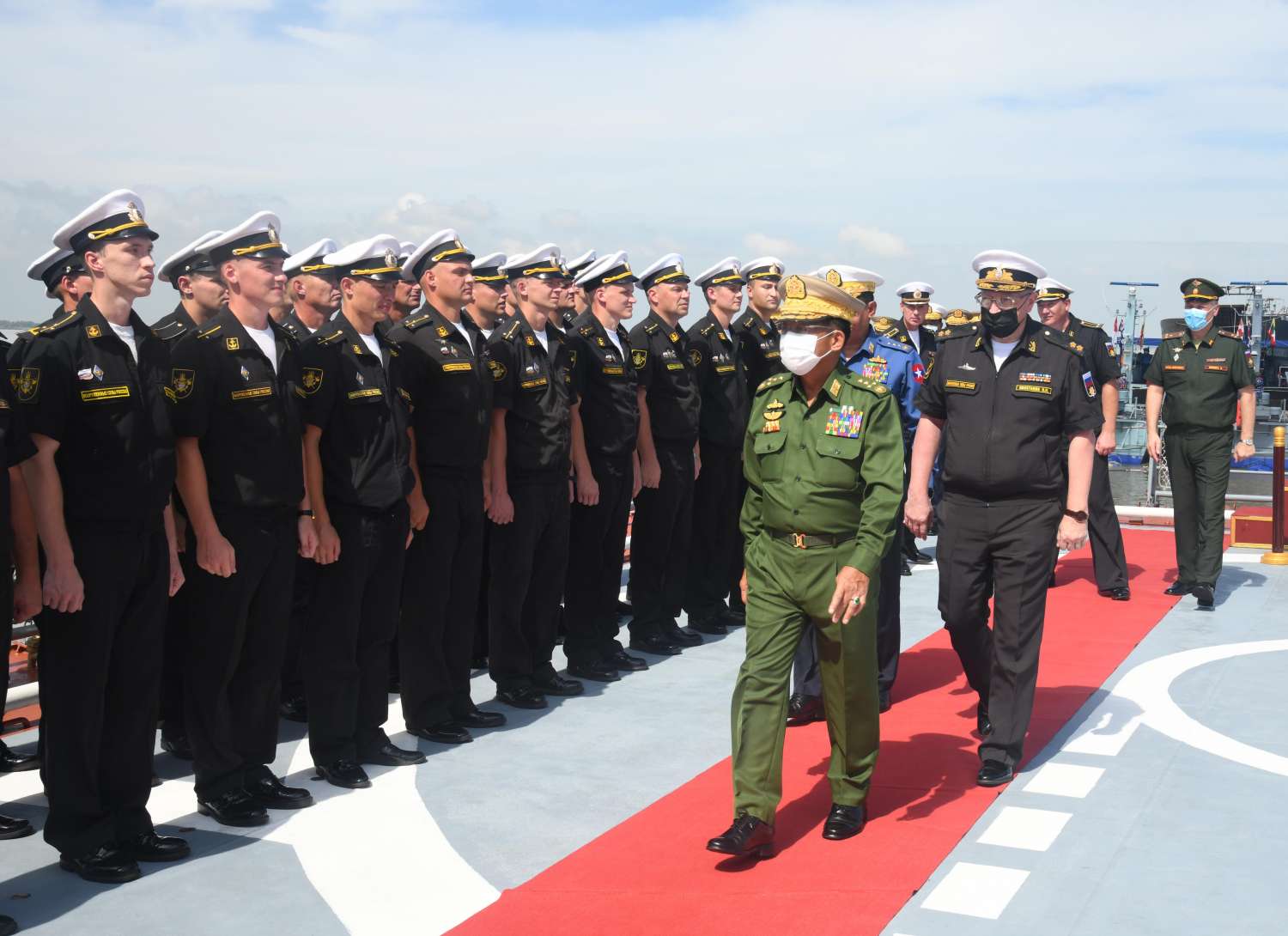 ဦးစွာ နိုင်ငံတော်စီမံအုပ်ချုပ်ရေးကောင်စီဥက္ကဋ္ဌ၊ တပ်မတော်ကာကွယ်ရေး ဦးစီးချုပ်သည် ကာကွယ်ရေးဦးစီးချုပ်(ရေ) ဗိုလ်ချုပ်ကြီး မိုးအောင်၊ ကာကွယ်ရေး ဦးစီးချုပ်(လေ) ဗိုလ်ချုပ်ကြီး မောင်မောင်ကျော်၊ ကာကွယ်ရေးဦးစီးချုပ်ရုံးမှ တပ်မတော်အရာရှိကြီးများ၊ ရန်ကုန်တိုင်း စစ်ဌာနချုပ် တိုင်းမှူးနှင့် တာဝန်ရှိသူများ လိုက်ပါ၍ ရန်ကုန်မြို့၊ သီလဝါဆိပ်ကမ်း MITT တံတားသို့ ရောက်ရှိကြရာ ရုရှားဖက်ဒရေးရှင်းနိုင်ငံ၊ ဒုတိယရေတပ်ဦးစီးချုပ် Vice Admiral Vladimir Lvovich kasatonov နှင့် စစ်ရေယာဉ်မှူး Captain Andrey Kuznetsov တို့က ကြိုဆို နှုတ်ဆက်ကြသည်။ ထို့နောက် နိုင်ငံတော်စီမံအုပ်ချုပ်ရေးကောင်စီ ဥက္ကဋ္ဌ၊ တပ်မတော်ကာကွယ် ရေးဦးစီးချူပ်သည် ရုရှားစစ်ရေယာဉ် Gremyashiy ပေါ်၌ ရုရှားစစ်ရေယာဉ် ဂုဏ်ပြုတပ်ဖွဲ့က နှစ်နိုင်ငံ နိုင်ငံတော်တေးသီချင်းဖြင့် ဂုဏ်ပြုကြိုဆိုအလေးပြုခြင်းကို ခံယူသည်။