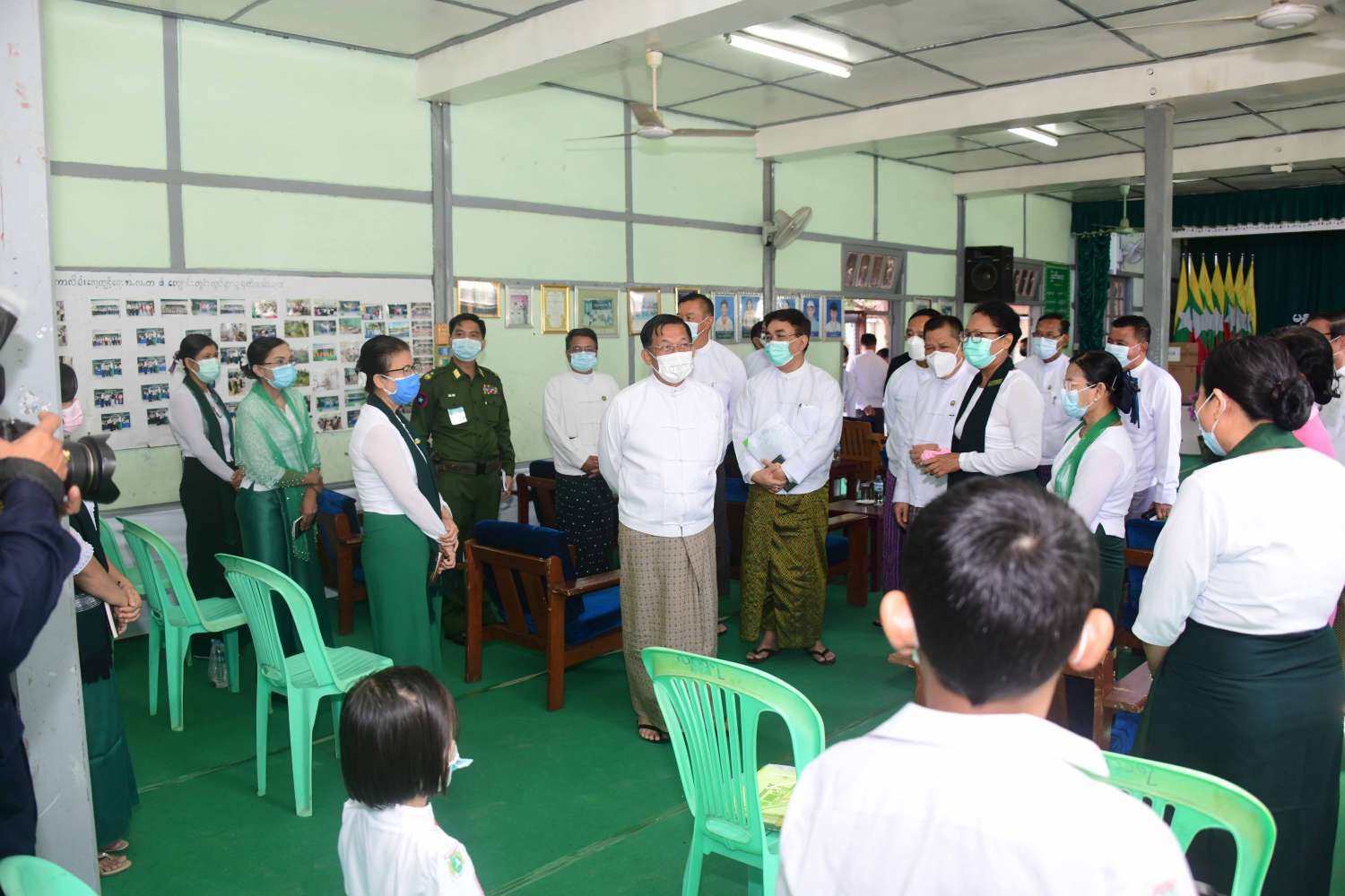 ဦးစွာ နိုင်ငံတော်စီမံအုပ်ချုပ်ရေးကောင်စီဥက္ကဋ္ဌ နိုင်ငံတော်ဝန်ကြီးချုပ်နှင့် အဖွဲ့ဝင်များသည် လေ့ကျင့်ရေးအလယ်တန်းကျောင်းသို့ ရောက်ရှိကြပြီး ကျောင်းအုပ်ဆရာမကြီးနှင့် ကျောင်းသား၊ ကျောင်းသူများအား ရင်းရင်းနှီးနှီးနှုတ်ဆက်သည်။ ထို့နောက် ကျောင်းရန်ပုံငွေနှင့် ကိုဗစ်-၁၉ ရောဂါ ကာကွယ်ရေးပစ္စည်းများကို ပေးအပ်ကာ ကျောင်းအတွင်း လှည့်လည်ကြည့်ရှု၍ ကျောင်းပြန်လည် ပြုပြင်မွမ်းမံနိုင်ရေးအတွက် လိုအပ်သည်များဖြည့်ဆည်း ဆောင်ရွက်ပေး သည်။