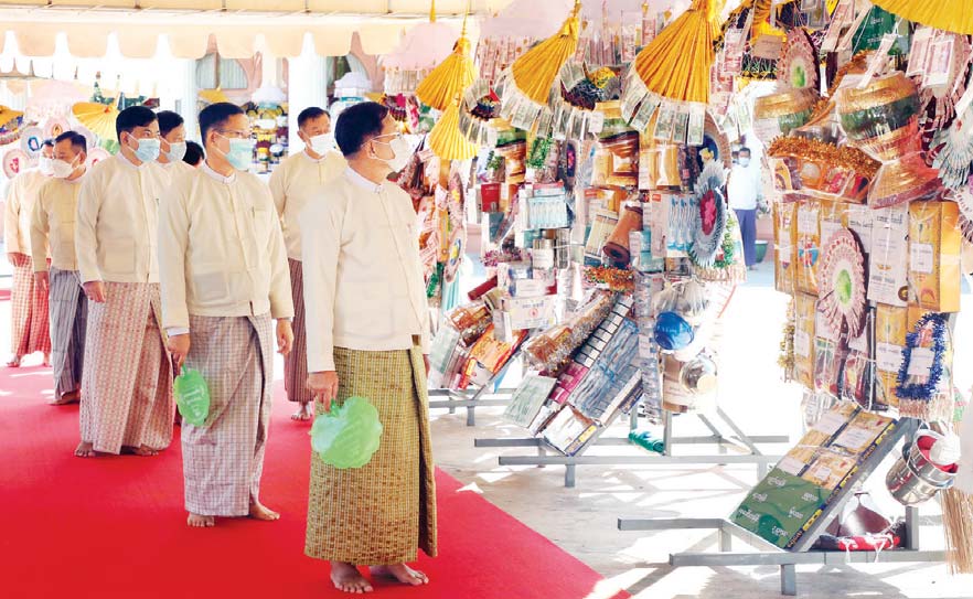 ဦးစွာ နိုင်ငံတော်စီမံအုပ်ချုပ်ရေးကောင်စီဥက္ကဋ္ဌ တပ်မတော်ကာကွယ်ရေးဦးစီးချုပ်၊ ဇနီးနှင့် ဧည့်ပရိသတ်များသည် ဘုန်းတော်ကြီး ကျောင်းအသီးသီးသို့ လှူဒါန်းရန် ခင်းကျင်းပြင်ဆင်ထား သည့် ကထိန်လျာသင်္ကန်း၊ လှူဖွယ်ပစ္စည်းများနှင့် ပဒေသာပင် များအား လှည့်လည်ကြည့်ရှုကြသည်။ ထို့နောက် နိုင်ငံတော်စီမံအုပ်ချုပ်ရေးကောင်စီဥက္ကဋ္ဌ တပ်မတော်ကာကွယ်ရေး ဦးစီးချုပ်နှင့် ဇနီးတို့သည် အနော်ရထာခန်းမအတွင်းရှိ ဗုဒ္ဓရုပ်ပွားတော်မြတ်အား ဖူးမြော်ကြည်ညို၍ မြသပိတ်ဆွမ်းတော်နှင့် ပန်း၊ သောက်တော်ရေချမ်း၊ ဆီမီး၊ သစ်သီးတို့ကို ဆက်ကပ်လှူဒါန်းသည်။