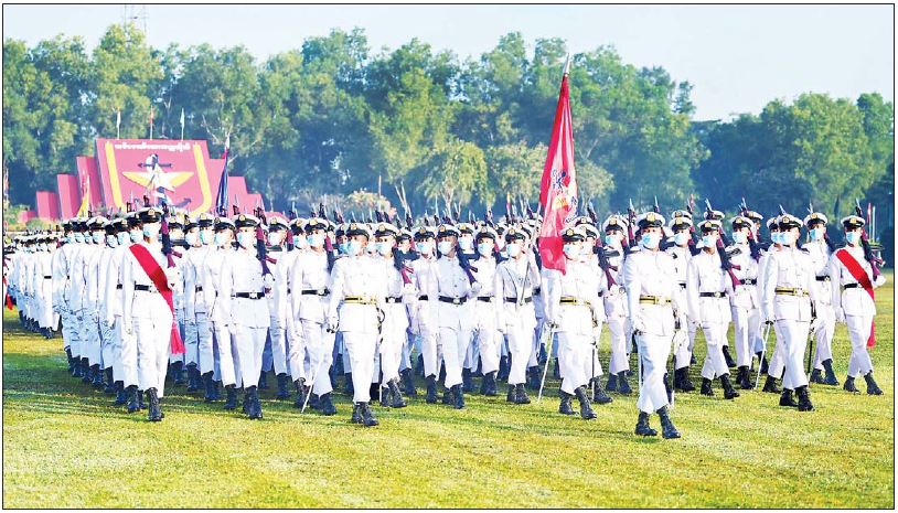 ယင်းနောက် နိုင်ငံတော်စီမံအုပ်ချုပ်ရေးကောင်စီဥက္ကဋ္ဌ၊ တပ်မတော်ကာကွယ်ရေး ဦးစီးချုပ် ဗိုလ်ချုပ်မှူးကြီး မဟာသရေစည်သူ မင်းအောင်လှိုင် သည် ဗိုလ်လောင်းတပ်ခွဲ များ၏ အလေးပြုခြင်းကို ခံယူပြီးနောက် စစ်ရေးပြအခမ်းအနားမှ ပြန်လည်ထွက်ခွာ သည်။
