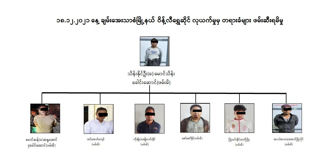 အထူးအမှုစစ်အဖွဲ့သည် “ဝိန့်လီ”ရွှေဆိုင် ဓားပြတိုက်မှုကျူးလွန်သူများအား ဖမ်းဆီးရမိရေး တာဝန်သိပြည်သူများ၏ ပူးပေါင်း ကူညီမှုနှင့်ရရှိသည့် သတင်းအချက်အလက်များအပေါ် အခြေခံ ကာ ကွင်းဆက်မပြတ် ဆက်လက်စုံစမ်းဖော်ထုတ်ခဲ့ရာ အဆိုပါ ဓားပြတိုက်မှုဖြစ်စဉ်တွင် ပါဝင်ခဲ့ပြီး မြောင်မြို့နယ်၌ ကွမ်းယာဆိုင်ဖွင့်လှစ်ရောင်းချနေသူ ကိုမျိုး(ခ) မျိုးလင်းနိုင် (သိန်းနိုင်ဦး၏ တပည့်ဖြစ်သူ)အား စစ်ကိုင်းမြို့၊ ကန်တလူစစ်ဆေးရေးဂိတ်၌ ၂၀၂၂ ခုနှစ်၊ ဇန်နဝါရီလ ၁၇ ရက်နေ့တွင် ဖမ်းဆီးရမိခဲ့သဖြင့် စစ်ဆေးခဲ့ရာ ၂၀၂၁ ခုနှစ်၊ အောက်တိုဘာလ ၁၇ ရက်နေ့တွင် ပြည်ကြီးတံခွန်မြို့နယ်ရှိ “မောသစ်” ရွှေဆိုင်လုယက်မှုနှင့် ဒီဇင်ဘာလ ၁၈ ရက်နေ့ ချမ်းအေးသာစံမြို့နယ်၊ “ဝိန့်လီ" ရွှေဆိုင်ဓားပြတိုက်မှု ဖြစ်စဉ်တို့တွင် ၎င်းကိုယ်တိုင် ပါဝင်ကျူးလွန်ခဲ့ ကြောင်းနှင့် လုယက်မှုဖြစ်စဉ်များတွင် သိန်းနိုင်ဦး (ခ)မောင်သိန်း၊ မောင်ဆန်(ခ) ဆန္ဒအောင်၊ ထင်အောင်ကျော်၊ ဇော်ဇော်နိုင်၊ ဖြိုးမင်းနိုင်(ခ)ကိုဖြိုး၊ အငယ်လေး (ခ) အောင်ဖြိုးပိုင်၊ မောင်ဟိန်း(ခ)ဟိန်းကိုကို တို့(၇)ဦး ပါဝင်ကျူးလွန်ခဲ့ကြကြောင်း ဖော်ထုတ် သိရှိခဲ့ရပါသည်။