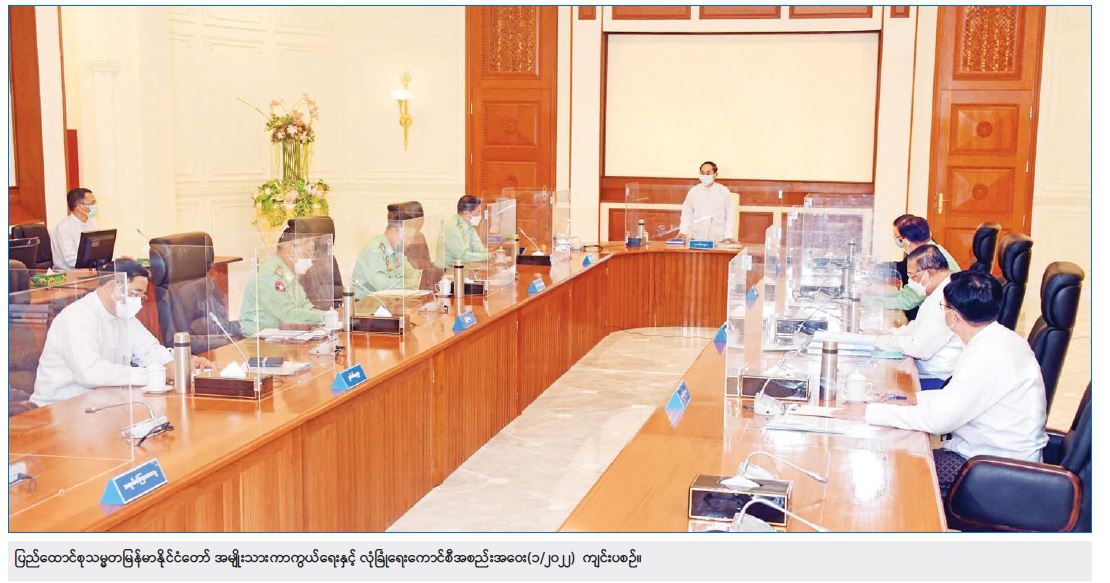 ယင်းနောက် တပ်မတော်ကာကွယ်ရေးဦးစီးချုပ်က ဖြည့်စွက်ဆွေးနွေးရာတွင် “ကျွန်တော်တို့ ပြီးခဲ့တဲ့ ကာလအတွင်းမှာ ပဋိပက္ခတွေဖြစ်ပွားတဲ့ အခါမှာ  တတ်နိုင်သလောက် သွေးထွက် သံယိုမှုအနည်းဆုံး၊ အာဃာတတရားအနည်းဆုံးဖြစ်အောင် ရည်ရွယ်ပြီးတော့မှ ထိန်းသိမ်း ဆောင်ရွက်ခဲ့တာရှိပါတယ်၊ အထူးသဖြင့် ပြည်သူများကို ကာကွယ်တဲ့နေရာမှာ ပြည်သူများ အားလုံးကို ကျွန်တော်တို့ ကာကွယ်မှုမပေး နိုင်တာတော့ ရိုးသားစွာဝန်ခံပါတယ်၊ ဒါကတော့ မြန်မာနိုင်ငံရဲတပ်ဖွဲ့နဲ့ တပ်မတော်သားတွေကိုလည်း လိုအပ်တဲ့နေရာမှာ တစ်နိုင်ငံလုံး ဖြန့်ကျက်ပြီး ဆောင်ရွက်ရတဲ့အတွက်ကြောင့် ကျွန်တော်တို့ဒီမှာ ပြည်သူအားလုံးကိုလည်း အလုံးစုံကာကွယ်မှုတော့ မပေးနိုင်ခဲ့ပါဘူး၊ တချို့ပြည်နယ်နှင့် တိုင်းများဖြစ်တဲ့၊ အခုအခြေအနေ မှာ ကယားပြည်နယ်၊ ချင်းပြည်နယ်နဲ့ စစ်ကိုင်းတိုင်းအချို့မြို့နယ်တွေမှာ အကြမ်းဖက်မှု ဖြစ်စဉ်များ ရှိနေဆဲဖြစ်ပါတယ်၊ ဒါကိုလည်း အတတ်နိုင်ဆုံး ဆောင်ရွက်လျက်ရှိပါတယ်၊ အဆိုးဆုံးကတော့ အုပ်ချုပ်ရေးအဖွဲ့မှာ တာဝန်ရှိတဲ့ပုဂ္ဂိုလ်များ လုပ်ကြံသတ်ဖြတ်ခံရခြင်း ဖြစ်ပါတယ်၊ ပြည်နယ်နဲ့တိုင်းအသီးသီးမှာရှိတဲ့  မြို့နယ် ၁၀၉ မြို့နယ်မှာ ဖြစ်စဉ်ပေါင်း ၂၇၂ ကြိမ်ရှိပြီးတော့မှ လုပ်ကြံသတ်ဖြတ်ခံရသူပေါင်း ၂၈၂ ယောက်ရှိခဲ့ပါတယ်၊ တစ်ခါ ဒီထက်ဆိုး တာကတော့ ပညာရေးဝန်ထမ်းများနှင့် ကျန်းမာရေးဝန်ထမ်းများကို သတ်ဖြတ်ခြင်းဖြစ်ပါတယ်၊ ကျောင်းဆရာ၊ ဆရာမ ၃၀ ဦးကို သတ်ခဲ့တာရှိပါတယ်၊ ကျောင်းတွေမီးရှို့ဖျက်ဆီးခဲ့တာ ၅၀၄ ကြိမ်ရှိပါတယ်၊ ကျန်းမာရေးဝန်ထမ်းများကို သတ်ဖြတ်ခဲ့တာရှိပါတယ်၊ တိုက်ခိုက်ခဲ့တာ ရှိပါတယ်၊ ဒါကြောင့်အများပြည်သူတွေရဲ့ လူမှုစီးပွားဘဝတိုးတက်ရေးအတွက် အဓိက လိုအပ်ချက်ဖြစ်တဲ့ ပညာသင်ကြားရေးနဲ့ ကျန်းမာရေးစောင့်ရှောက်မှု လုပ်ငန်းတွေဒီထက်ပိုပြီး ထိထိရောက်ရောက် ဆောင်ရွက်နိုင်ဖို့အတွက် အချိန်တစ်ခုပေးပြီးတော့ ဆောင်ရွက်ဖို့လိုအပ် ပါတယ်၊ ဒါလည်း ကောင်စီဝင်များအနေနဲ့ ထည့်သွင်းစဉ်းစားပြီးတော့မှထားဖို့ တင်ပြ လိုပါတယ်၊ ထောက်ခံတင်ပြပေးတဲ့အတွက်လည်း ကျွန်တော်ကျေးဇူးတင်ပါတယ်၊ ဒါပေမယ့် လုပ်ဆောင်ရတဲ့ လုပ်ငန်းပမာဏကလည်း တော်တော်လေး ကြီးမားပါတယ်၊ အခုဆိုရင်လည်း ကိုဗစ်နဲ့ပတ်သက်ပြီးတော့ ကျွန်တော်တို့ ထိန်းချုပ်နိုင်ပြီဆိုသော်လည်းပဲ အိုမီခရွမ်တွေ့ရှိမှု ကလည်းရှိနေပါတယ်၊ တွေ့ရှိမှုရှိတဲ့အတွက်ကြောင့် ဒါကိုလည်းသတိကြီးစွာထားပြီး ဆောင်ရွက် ရမှာ ဖြစ်ပါတယ်၊ ဒါကိုထိန်းချုပ်နိုင်ဖို့အတွက် တစ်ဖက်က နေထိုင်မှုစည်းကမ်းတွေကို ထိန်းချုပ် သလိုပဲ တစ်ဖက်ကကာကွယ်ခြင်း ကုသခြင်းအပိုင်းတွေ၊ လိုအပ်တဲ့ပစ္စည်းတွေ၊ ဆေး