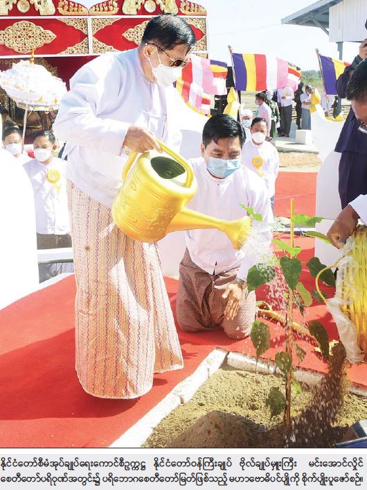 ထို့နောက် နိုင်ငံတော်စီမံအုပ်ချုပ်ရေး ကောင်စီဥက္ကဋ္ဌ နိုင်ငံတော်ဝန်ကြီးချုပ်နှင့် အဖွဲ့ဝင်များသည် ပွင့်ဖြူမြို့နယ်ရှိ သာသနာဝင် မြန်မာပြည် ဗုဒ္ဓဂါယာ စန္ဓကူးနံ့သာ ကျောင်းတော်ရာ စေတီတော်သို့ သွားရောက်ဖူးမြော်ကြည်ညိုပြီး ပန်း၊ ရေချမ်း၊ ဆီမီး ကပ်လှူပူဇော်သည်။ ယင်းနောက် စေတီတော်ကြီးအတွက် ဘက်စုံအလှူငွေများ ပေးအပ်လှူဒါန်းရာ ဂေါပကအဖွဲ့ဝင်များက လက်ခံရယူပြီး ဓမ္မလက်ဆောင် ပြန်လည်ပေးအပ်သည်။ ဆက်လက်ပြီး နိုင်ငံတော်စီမံအုပ်ချုပ်ရေး ကောင်စီဥက္ကဋ္ဌ နိုင်ငံတော်ဝန်ကြီးချုပ်၊ ဇနီးနှင့် အဖွဲ့ဝင်များသည် ဘုရားအကျိုးတော်ဆောင်ချုပ် ဆရာတော် အဂ္ဂမဟာ သဒ္ဓမ္မ ဇောတိကဓဇ ဘဒ္ဒန္တ ဓမ္မာစာရအား ဖူးမြော်ကြည်ညိုပြီး သာသနာရေးဆိုင်ရာများနှင့် ကျန်းမာရေးဆိုင်ရာများ မေးမြန်းလျှောက်ထားကာ လှူဖွယ်ပစ္စည်းများ ဆက်ကပ်လှူဒါန်းသည်။ ထို့နောက် စေတီတော်ကြီးအား လက်ယာရစ်လှည့်လည် ဖူးမြော်ကြည်ညိုပြီး ရေရှည်တည်တံ့ခိုင်မြဲရေးအတွက် စနစ်တကျ ထိန်းသိမ်းဆောင်ရွက်ရန် လိုအပ်သည်များ ဆွေးနွေးမှာကြားခဲ့ကြောင်း သတင်းရရှိသည်။