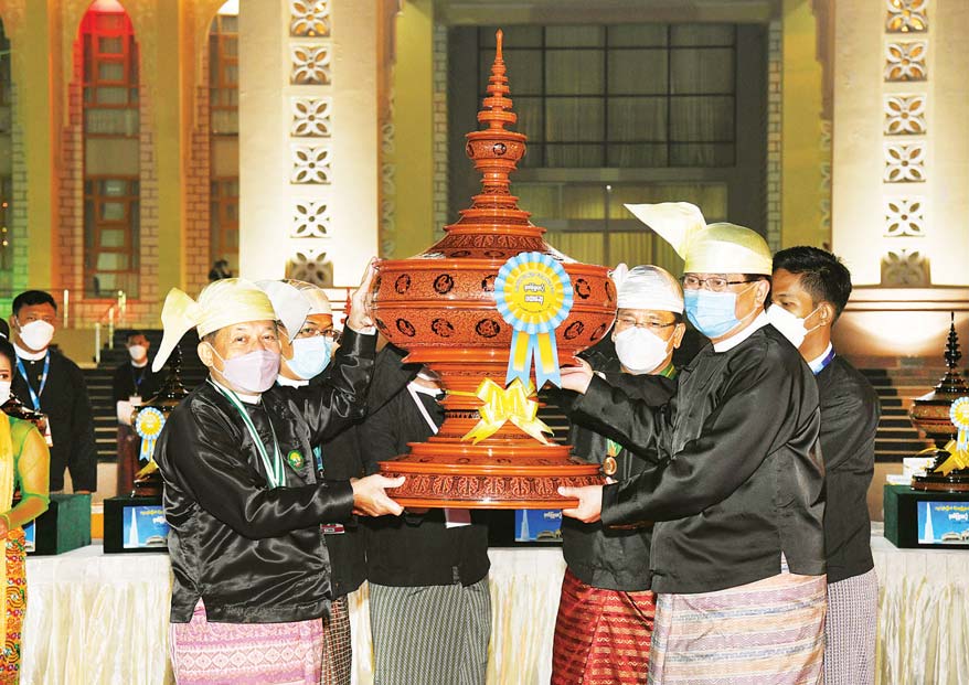 ယင်းနောက် နိုင်ငံတော်စီမံအုပ်ချုပ်ရေးကောင်စီဥက္ကဋ္ဌ နိုင်ငံတော်ဝန်ကြီးချုပ် ဗိုလ်ချုပ်မှူးကြီး မဟာသရေစည်သူ မင်းအောင်လှိုင်က ဂုဏ်ပြုယာဉ်ပထမဆုရရှိသည့် မကွေးတိုင်းဒေသကြီး အတွက် ဂုဏ်ပြုဆုနှင့်ဂုဏ်ပြုဆုငွေများကို တိုင်းဒေသကြီးဝန်ကြီးချုပ် ဦးတင့်လွင်ထံ လည်းကောင်း ပေးအပ်ချီးမြှင့်သည်။ ဆုချီးမြှင့်ပွဲအပြီးတွင် ၂၀၂၂ ခုနှစ် (၇၅)နှစ်မြောက် စိန်ရတုပြည်ထောင်စုနေ့ကို ဂုဏ်ပြုသောအားဖြင့် မီးရှူးမီးပန်းများ ပစ်ဖောက်ဂုဏ်ပြုသည်။