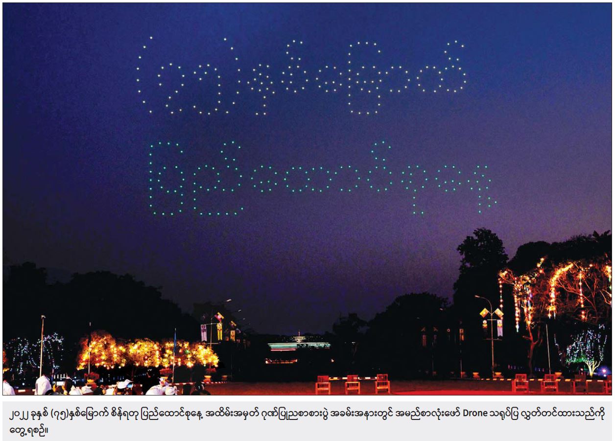 ယင်းနောက် နိုင်ငံတော်ဝန်ကြီးချုပ် ဗိုလ်ချုပ်မှူးကြီး မဟာသရေစည်သူ မင်းအောင်လှိုင်နှင့်ဇနီး ဒေါ်ကြူကြူလှတို့သည် ဂုဏ်ပြုညစာ စားပွဲအခမ်းအနားသို့ တက်ရောက်လာကြသူများနှင့်အတူ သတ်မှတ်နေရာအသီးသီး၌ နေရာယူကြပြီး စိန်ရတုပြည်ထောင်စုနေ့၊ တိုင်းဒေသကြီး နှင့် ပြည်နယ်ကိုယ်စားပြု အလံ၊ မြေပုံနှင့် အမည်စာလုံးဖော် Drone သရုပ်ပြလွှတ်တင်ခြင်း အစီအစဉ်ကို ကြည့်ရှုအားပေးကြသည်။