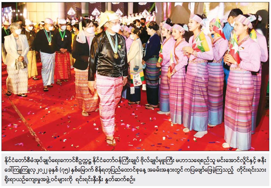 ဖျော်ဖြေတင်ဆက်မှုများအပြီးတွင် နိုင်ငံတော်စီမံအုပ်ချုပ်ရေးကောင်စီဥက္ကဋ္ဌ နိုင်ငံတော် ဝန်ကြီးချုပ် ဗိုလ်ချုပ်မှူးကြီး မဟာသရေစည်သူ မင်းအောင်လှိုင်နှင့်ဇနီး ဒေါ်ကြူကြူလှတို့သည် ၂၀၂၂ ခုနှစ် (၇၅) နှစ်မြောက် စိန်ရတုပြည်ထောင်စုနေ့ အခမ်းအနားတွင် ကပြဖျော် ဖြေခဲ့ကြသည့် တိုင်းရင်းသားရိုးရာယဉ်ကျေးမှုအဖွဲ့ဝင်များကို ရင်းရင်းနှီးနှီး နှုတ်ဆက်ကြသည်။