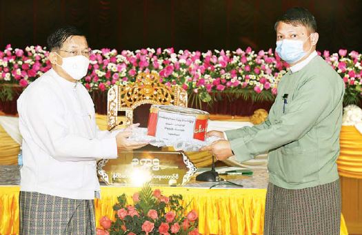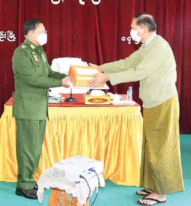 ထို့နောက် နိုင်ငံတော်စီမံအုပ်ချုပ်ရေးကောင်စီဥက္ကဋ္ဌ နိုင်ငံတော် ဝန်ကြီးချုပ် က ကျိုင်းတုံမြို့နယ်၊ မိုင်းပျဉ်းမြို့နယ်နှင့် ရှမ်းပြည်နယ်(တောင်ပိုင်း) ခိုလမ်မြို့နယ်တို့ရှိ ပြည်နယ်၊ ခရိုင်၊ မြို့နယ်အဆင့် ဌာနဆိုင်ရာတာဝန်ရှိသူများနှင့် မြို့မိမြို့ဖများအတွက် လက်ဆောင် ပစ္စည်းများကို ပေးအပ်ရာ အုပ်ချုပ်ရေးမှူးများက အသီးသီးလက်ခံရယူ ကြသည်။