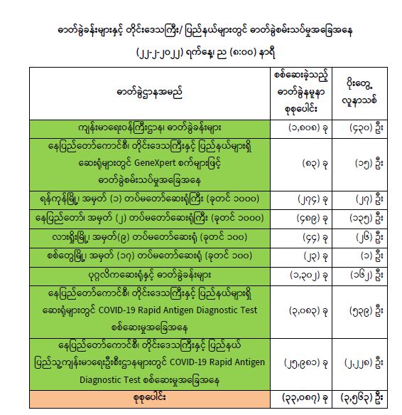 သို့ဖြစ်ပါ၍ ယနေ့အထိ ဓာတ်ခွဲနမူနာစုစုပေါင်း (၆,၉၆၉,၀၇၀) ခုအား စစ်ဆေးခဲ့ပြီး COVID-19 ဓာတ်ခွဲအတည်ပြုလူနာ စုစုပေါင်း (၅၇၂,၁၂၇) ဦး ရှိပြီ ဖြစ်ပါသည်။