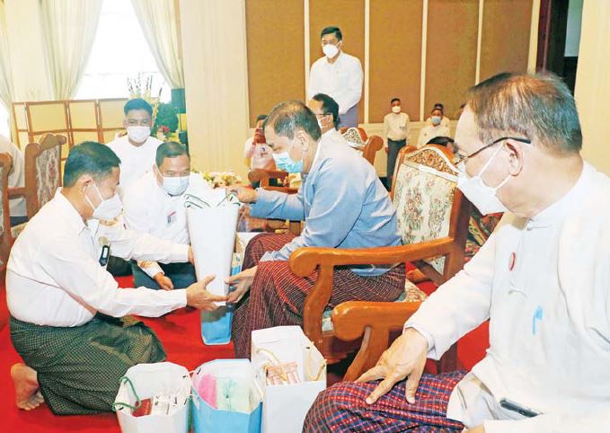 ၎င်းနောက် နိုင်ငံတော်စီမံအုပ်ချုပ်ရေးကောင်စီဥက္ကဋ္ဌ တပ်မတော်ကာကွယ်ရေး ဦးစီးချုပ်နှင့်ဇနီး၊ တက်ရောက်လာကြသည့် တပ်မတော်အရာရှိကြီးများနှင့် ဇနီးများက တပ်မတော်(ကြည်း၊ ရေ၊ လေ) မိသားစုများကိုယ်စား အငြိမ်းစားတပ်မတော်အရာရှိကြီး များအား မြန်မာ့ရိုးရာထုံးတမ်းအစဉ်အလာနှင့် အညီ ရိုသေစွာဖြင့် ဂါရဝပြုကန်တော့ကြသည်။