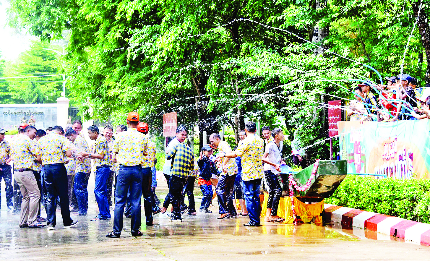 ဦးစွာ နိုင်ငံတော်စီမံအုပ်ချုပ်ရေးကောင်စီဥက္ကဋ္ဌ တပ်မတော်ကာကွယ်ရေးဦးစီးချုပ်၊ ဇနီးနှင့် အဖွဲ့ဝင် များသည် နံနက်ပိုင်းတွင် တပ်မတော်အုပ်ချုပ်မှုကျောင်း မိသားစု အတာရေသဘင်မဏ္ဍပ်သို့ ရောက်ရှိ ကြရာ သင်တန်းသားအရာရှိများ၊ အရာရှိ၊ စစ်သည်၊ မိသားစုဝင်များက လှိုက်ကြိုဆိုနှုတ်ဆက်ကြ သည်။ ထို့နောက် မိသားစုသင်္ကြန်ယိမ်းအက အဖွဲ့များ၏ သီဆိုကပြဖျော်ဖြေမှုများ၊ အရာရှိ၊ စစ်သည်၊ မိသားစုများ၏ တေးသီချင်းများဖြင့် သီဆိုဖျော်ဖြေမှုများဖြင့် ရေသဘင်ပွဲတော်ကို ပျော်ရွှင်စွာ ဆင်နွှဲနေမှုများကို ကြည့်ရှုအားပေးပြီးအရာရှိ၊ စစ်သည် မိသားစုများအား အတာရေများ ပက်ဖျန်းပေး သည်။