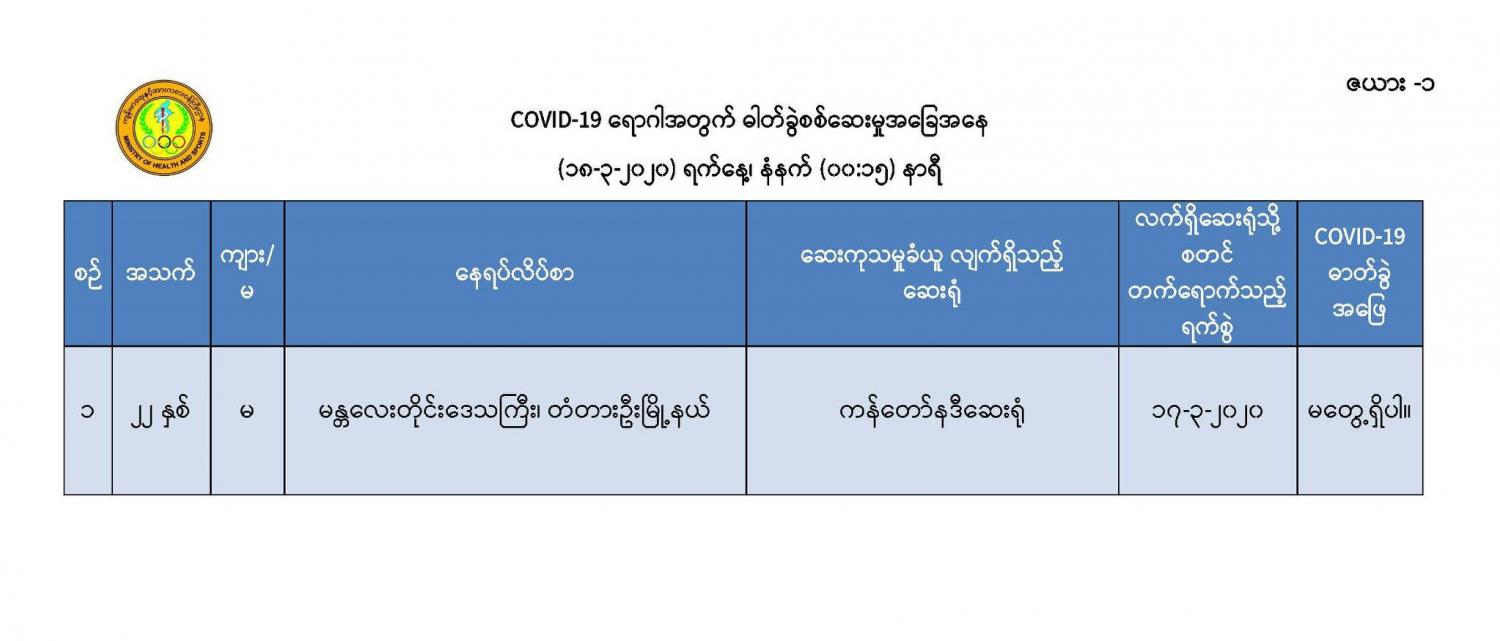 ၂။ ယနေ့နံနက် (၁၈-၃-၂၀၂၀) ရက်နေ့၊ နံနက် (၀၀:၀၅) နာရီတွင် အမျိုးသားကျန်းမာရေး ဓာတ်ခွဲမှု ဆိုင်ရာဌာန (ရန်ကုန်) မှ ပေးပို့လာသော ဓာတ်ခွဲအဖြေအရ (ဇယား -၁) တွင် ဖော်ပြထားသော စောင့်ကြည့်လူနာ၏ ဓာတ်ခွဲအဖြေတွင် COVID-19 ရောဂါပိုး မရှိကြောင်း သိရှိရပါသည်။