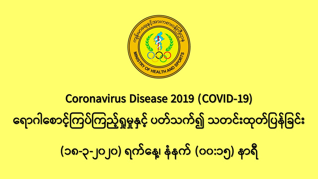 ၁။ ကျန်းမာရေးနှင့် အားကစားဝန်ကြီးဌာန၊ အမျိုးသားကျန်းမာရေး ဓာတ်ခွဲမှုဆိုင်ရာဌာန (ရန်ကုန်) သည် တိုင်းဒေသကြီး/ ပြည်နယ်ဆေးရုံအသီးသီးမှ COVID-19 ရောဂါ စောင့်ကြည့်လူနာများအဖြစ် သတ်မှတ်ထားရှိသော လူနာများထံမှ ဓာတ်ခွဲနမူနာများကို ဓာတ်ခွဲစစ်ဆေးပေးလျက်ရှိပါသည်။