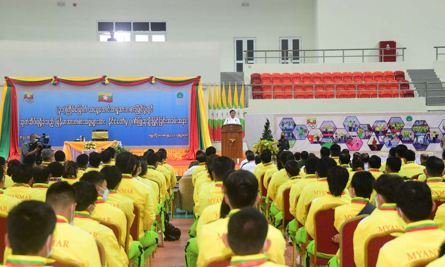 (၃၁)ကြိမ်မြောက် အရှေ့တောင်အာရှအားကစားပြိုင်ပွဲတွင် ဆုတံဆိပ်ရရှိခဲ့သည့် မြန်မာအားကစားအဖွဲ့များအား နိုင်ငံတော်က ဂုဏ်ပြုဆုချီးမြှင့်ခြင်း အခမ်းအနားကျင်းပ နိုင်ငံတော်စီမံအုပ်ချုပ်ရေးကောင်စီဥက္ကဋ္ဌ နိုင်ငံတော်ဝန်ကြီးချုပ် ဗိုလ်ချုပ်မှူးကြီး မင်းအောင်လှိုင် တက်ရောက်အမှာစကားပြောကြားပြီး ဂုဏ်ပြုဆုများ ပေးအပ်ချီးမြှင့်