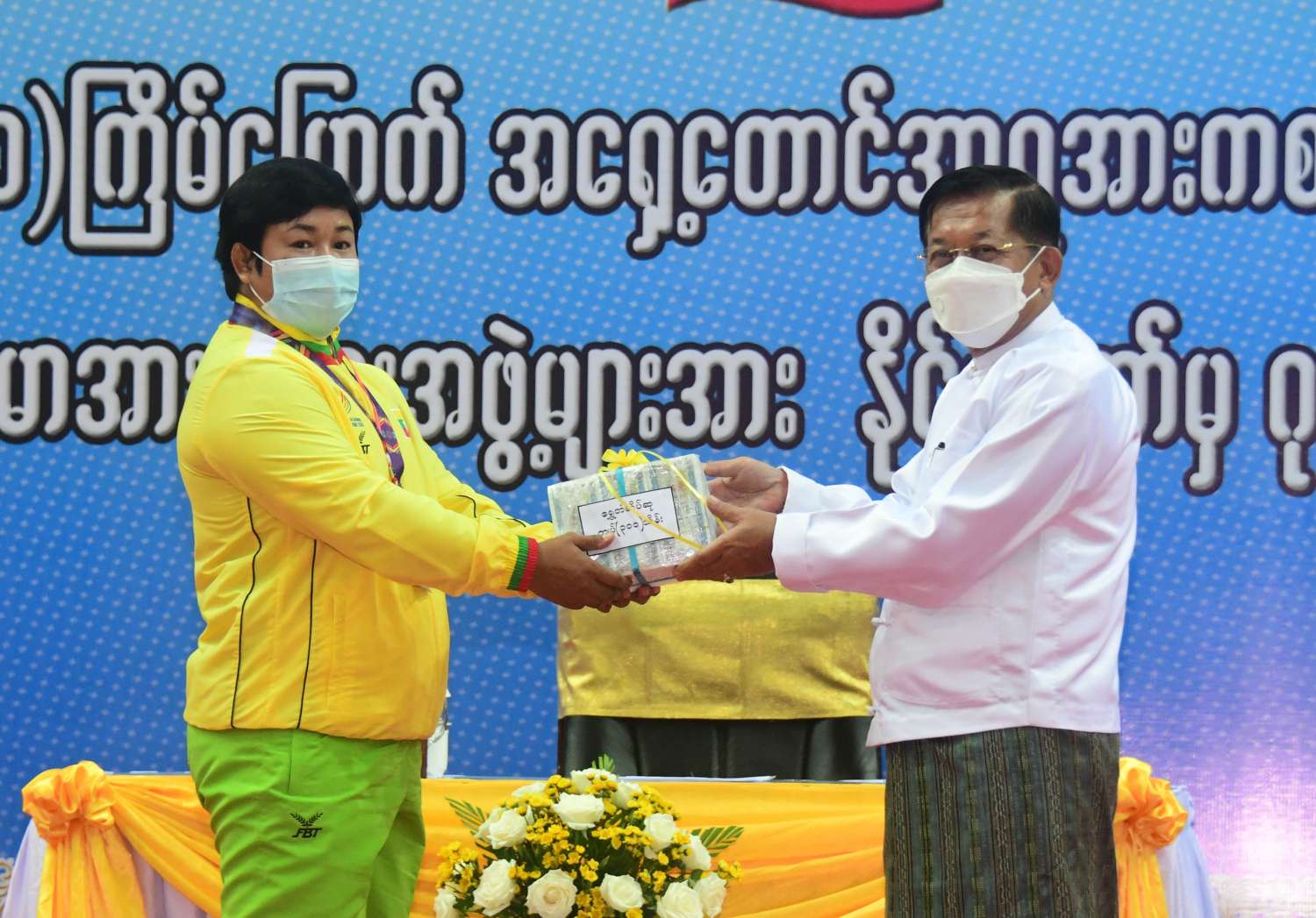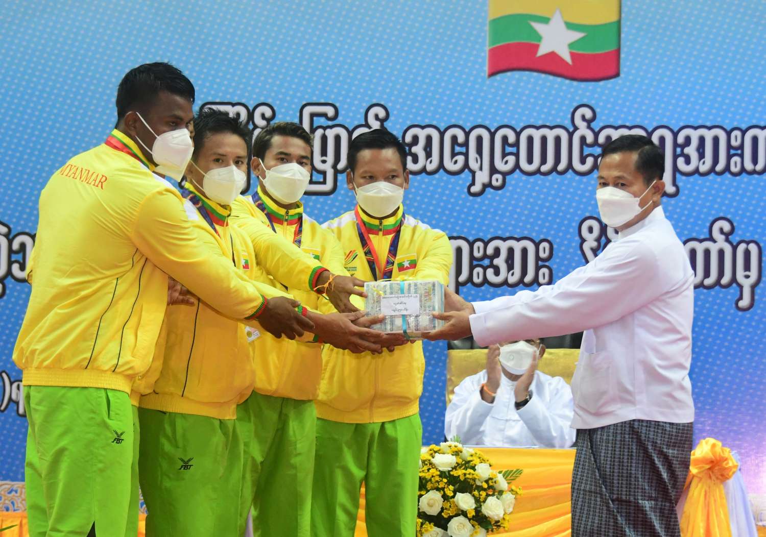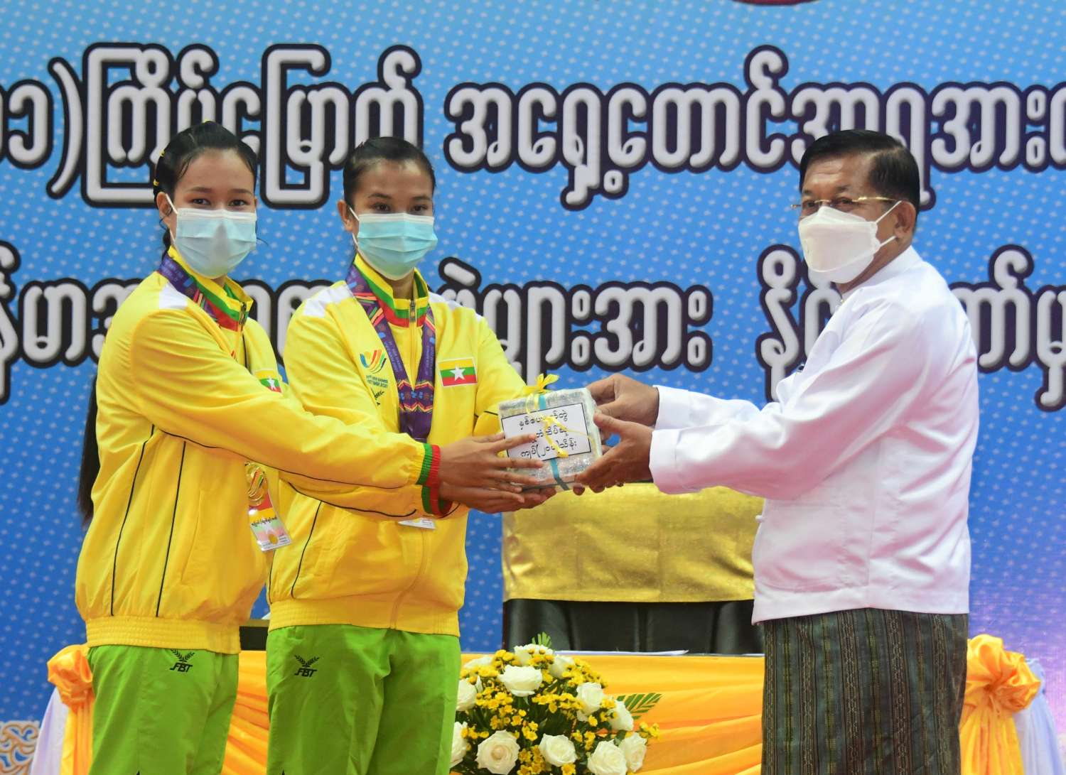 ထို့နောက် (၃၁)ကြိမ်မြောက် အရှေ့တောင်အာရှ အားကစားပြိုင်ပွဲတွင် ဆုတံဆိပ် ရရှိခဲ့သည့် နိုင်ငံ့ဂုဏ်ဆောင် ဆုရအားကစားသမားများ၊ နည်းပြများနှင့် အုပ်ချုပ်သူများကို ဂုဏ်ပြုဆုငွေများ ပေးအပ်ချီးမြှင့်ရာ နိုင်ငံတော်စီမံအုပ်ချုပ်ရေးကောင်စီဥက္ကဋ္ဌ နိုင်ငံတော်ဝန်ကြီးချုပ်က ရွှေတံဆိပ်ဆု ရရှိခဲ့ကြသည့် ဗိုဗီနမ် အားကစားနည်းမှ မောင်မနားကွီး၊ မောင်အိုက်စိုးလင်း၊ မောင်ဇင်လင်းထွန်း၊ မောင်ဇော်ဇော်၊ မောင်အောင်ခိုင်လင်း၊ မောင်ရာဇာထွန်း၊ မောင်ဟိန်းထက်အောင်၊ မောင်ကျော်သူစိုး အောင်၊ မခိုင်ဝါဖူး၊ မမေဟန်နီအောင်လွင်၊ ပိုက်ကျော်ခြင်း အားကစားနည်းမှ မခင်နှင်းဝေ၊ မဖြူဖြူသန်း၊ မယမုံဇင်၊ ဝူရှူး အားကစားနည်းမှ မောင်သိန်းသန်းဦး၊ Kurash အားကစားနည်းမှ မအေးအေးအောင်၊ ကာယဗလနှင့် ကာယကြံ့ခိုင်မှုအားကစားနည်းမှ မောင်ရဲထွန်းနောင်၊ ပီတန်း အားကစားနည်းမှ မခင်ချယ်ရီသက်၊ ဘိလိယက်နှင့် စနူကာ အားကစားနည်းမှ ဦးပေါက်စ တို့ကို ဂုဏ်ပြုချီးမြှင့်ငွေများ ပေးအပ်ချီးမြှင့်သည်။