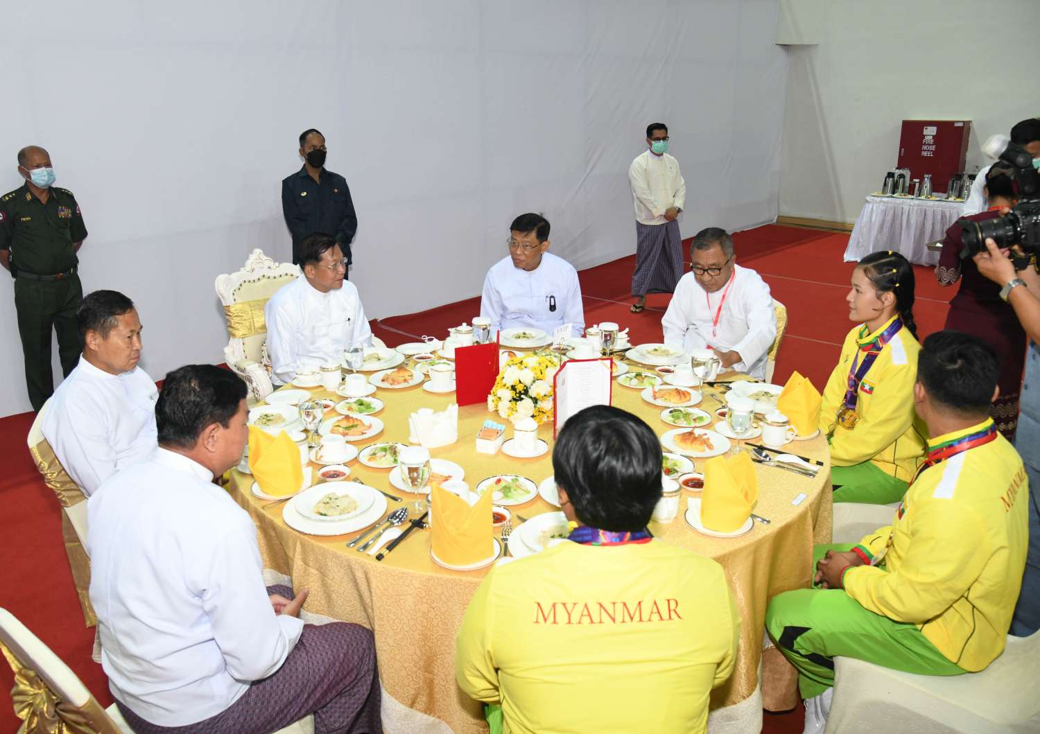 ယင်းနောက် နိုင်ငံတော်စီမံအုပ်ချုပ်ရေးကောင်စီဥက္ကဋ္ဌ၊ နိုင်ငံတော်ဝန်ကြီးချုပ်နှင့် အဖွဲ့ဝင်များသည် နိုင်ငံ့ဂုဏ်ဆောင်အားကစားသမားများနှင့် နည်းပြများကို ဂုဏ်ပြု လက်ဖက်ရည်ဝိုင်းဖြင့် တည်ခင်းဧည့်ခံခဲ့သည်။