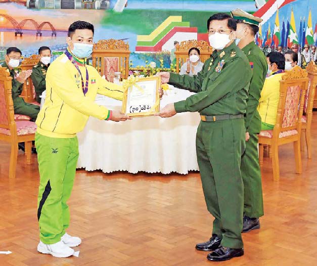 နိုင်ငံတော်နှင့်တပ်မတော်အတွက် စွမ်းစွမ်းတမံ ရေကုန်ရေခန်း ယှဉ်ပြိုင်ခဲ့ကြသည့် တပ်မတော်သားအားကစားသမားများကို ထိုက်သင့်သည့် ချီးမြှောက်မှုများ ပြုလုပ်ပေးလျက်ရှိ