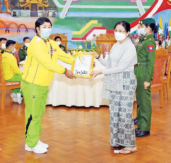 နိုင်ငံတော်စီမံအုပ်ချုပ်ရေးကောင်စီဒုတိယဥက္ကဋ္ဌ ဒုတိယတပ်မတော် ကာကွယ်ရေးဦးစီးချုပ်၊ ကာကွယ်ရေးဦးစီးချုပ် (ကြည်း)၏ဇနီးက ဝူရှူးအားကစားနည်း(တစ် ဦးချင်းပြိုင်ပွဲ)တွင် ကြေးတံဆိပ်ဆုရရှိခဲ့သည့် တပ်သားမျိုးမင်းထက်၊ ဗိုဗီနမ် အားကစားနည်း(တစ်ဦးချင်းပြိုင်ပွဲ)တွင် ကြေးတံဆိပ်ဆုရရှိခဲ့သည့် တပ်သားဝေသူလွင်၊ ပိုက်ကျော်ခြင်းအားကစားနည်း (အသင်းလိုက်) ပြိုင်ပွဲ(၂)ပွဲတွင် ကြေးတံဆိပ်ဆုရရှိခဲ့သည့် တပ်ကြပ်ကျော်ဇင်လတ်တို့ကို ဂုဏ်ပြုမှတ်တမ်းလွှာနှင့် ဂုဏ်ပြုဆုငွေများကိုလည်းကောင်း။