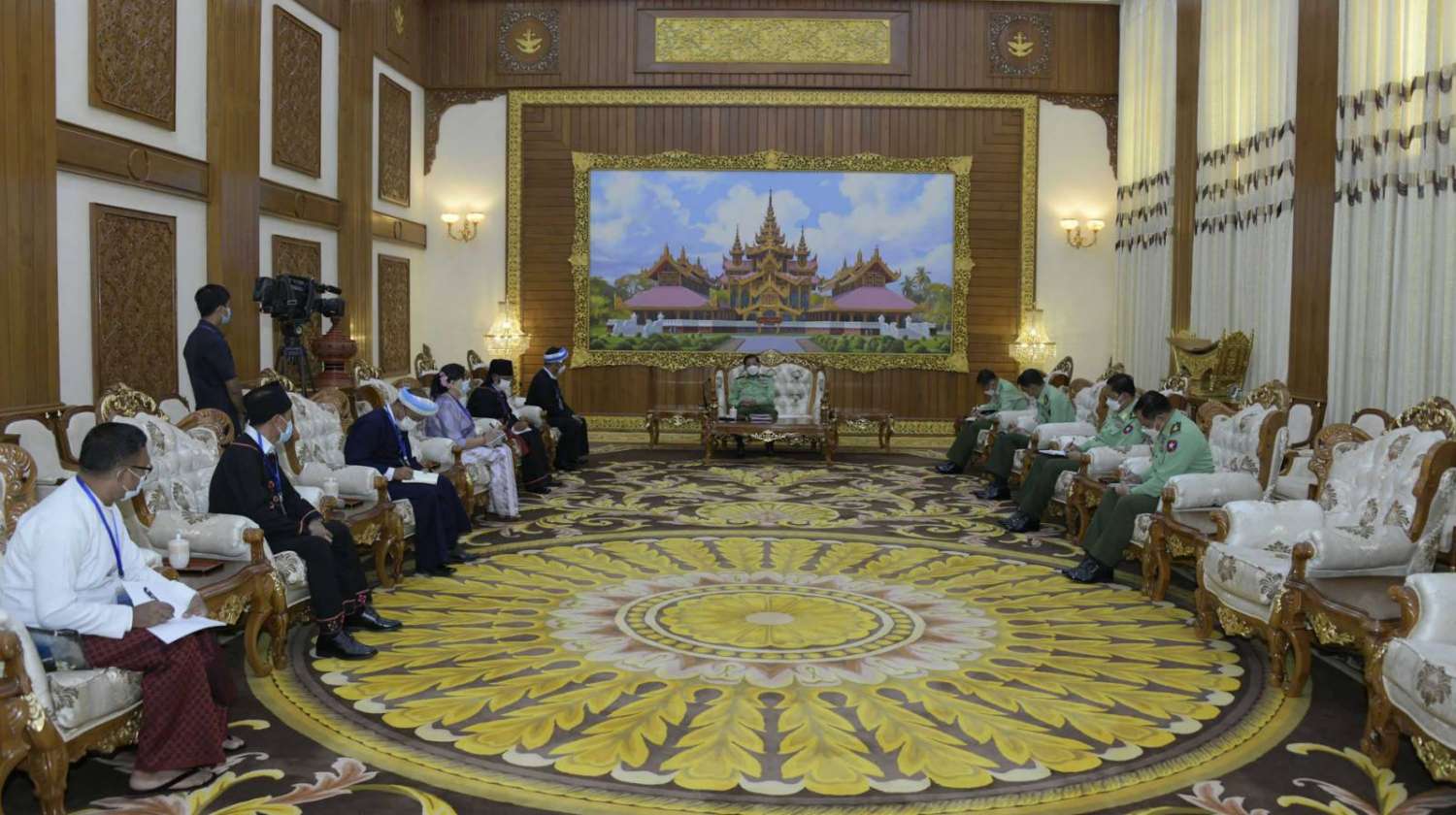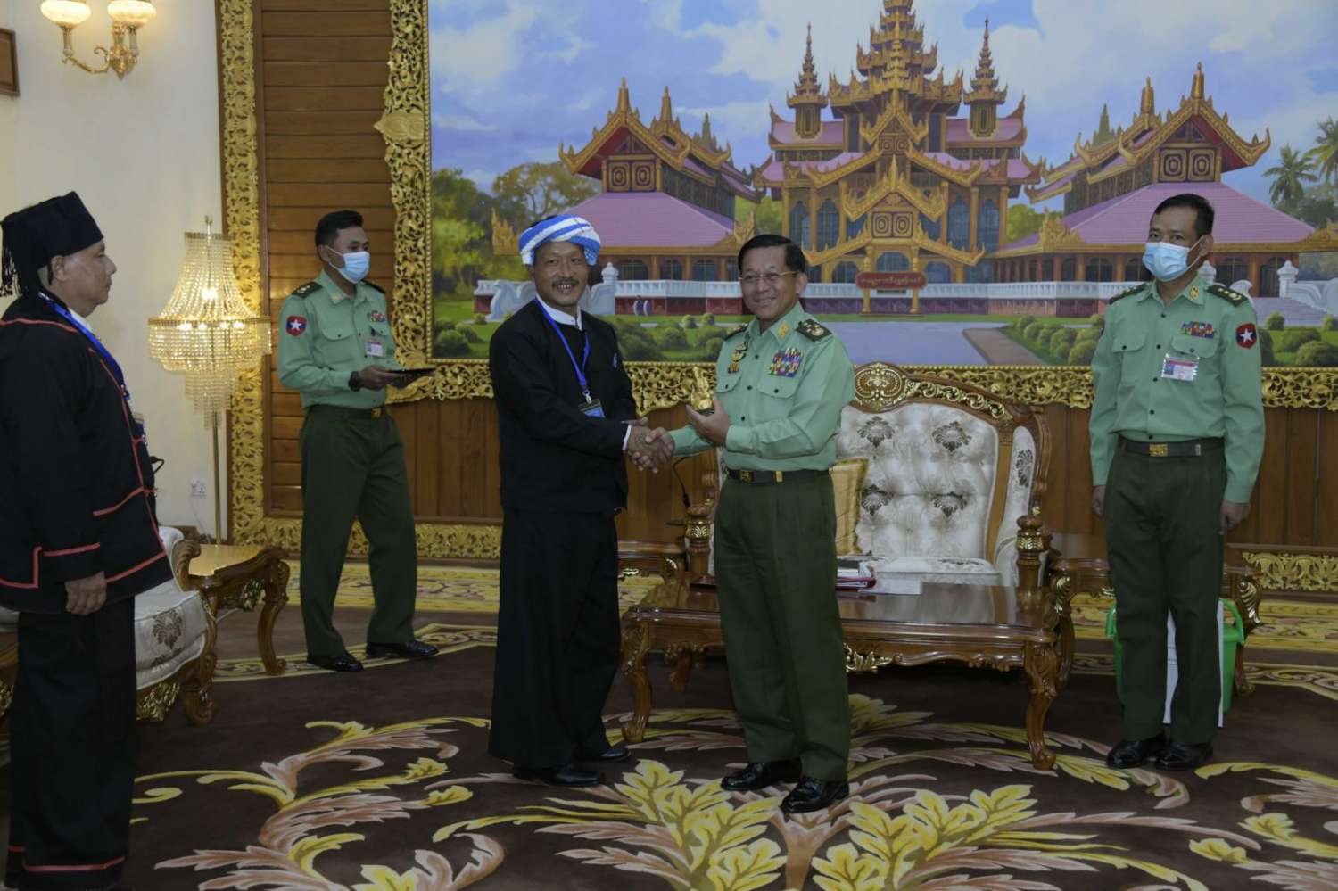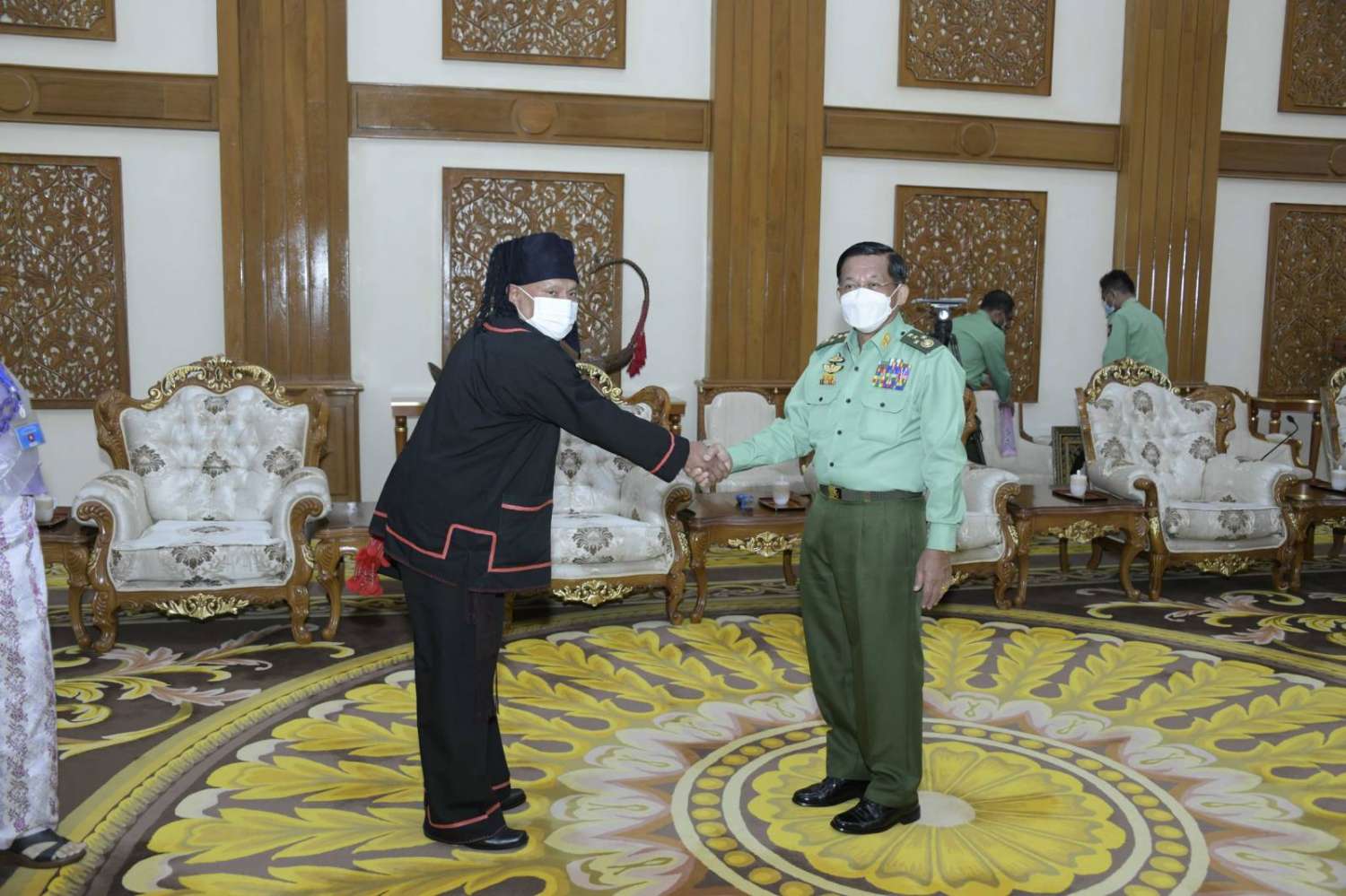 နိုင်ငံတော်စီမံအုပ်ချုပ်ရေးကောင်စီဥက္ကဋ္ဌ တပ်မတော်ကာကွယ်ရေးဦးစီးချုပ် ဗိုလ်ချုပ်မှူးကြီး မင်းအောင်လှိုင်သည် ပအိုဝ်းအမျိုးသားလွတ်မြောက်ရေးအဖွဲ့ချုပ် (PNLO)ဥက္ကဋ္ဌ ခွန်သူရိန်၊ လားဟူဒီမိုကရက်တစ်အစည်းအရုံး(LDU)ဥက္ကဋ္ဌ ကျောဆော်လမွန်နှင့် ရခိုင်ပြည် လွတ်မြောက်ရေးပါတီ (ALP) ဒုတိယဥက္ကဋ္ဌ စောမြရာဇာလင်းတို့ ဦးဆောင်သည့် ငြိမ်းချမ်းရေး ကိုယ်စားလှယ်အဖွဲ့အား ယနေ့နံနက်ပိုင်းတွင် နေပြည်တော်ရှိ ဘုရင့်နောင်ရိပ်သာ ဧည့်ခန်းမဆောင်၌ တွေ့ဆုံ၍ ငြိမ်းချမ်းရေးဆိုင်ရာ ကိစ္စရပ်များ ဆွေးနွေးသည်။