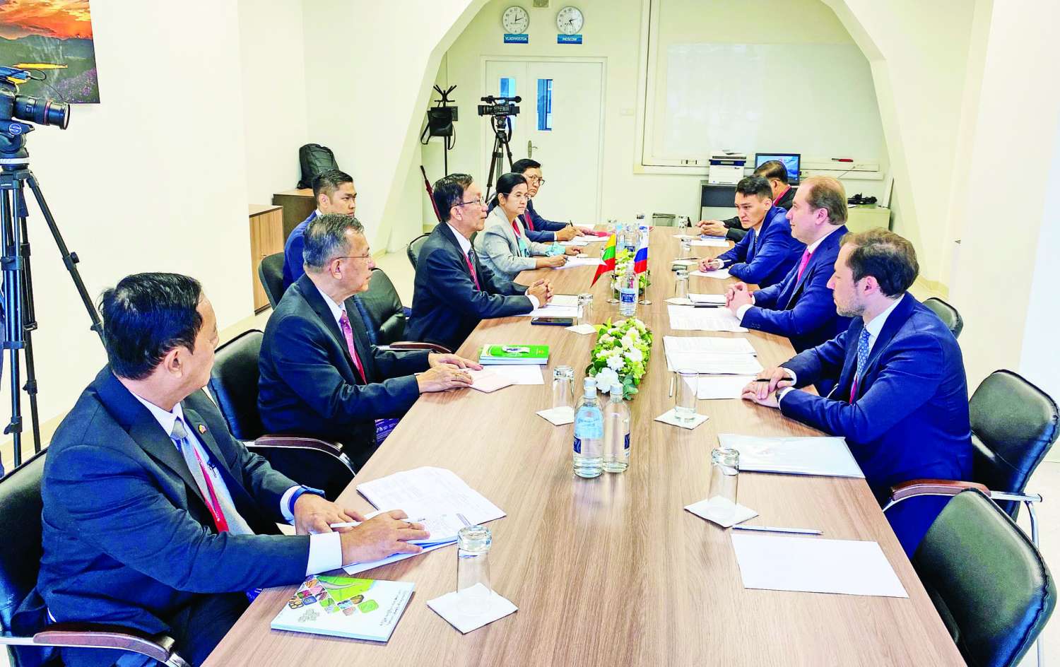နိုင်ငံတော်စီမံအုပ်ချုပ်ရေးကောင်စီဥက္ကဋ္ဌ နိုင်ငံတော်ဝန်ကြီးချုပ် ဗိုလ်ချုပ်မှူးကြီး မင်းအောင်လှိုင်နှင့်အတူ ရုရှားဖက်ဒရေးရှင်းနိုင်ငံသို့ ရောက်ရှိနေသည့် ပြည်ထောင်စုဝန်ကြီးများ၊ ဒုတိယဝန်ကြီးများ သက်ဆိုင်ရာကဏ္ဍအလိုက် ဆွေးနွေးဆောင်ရွက်