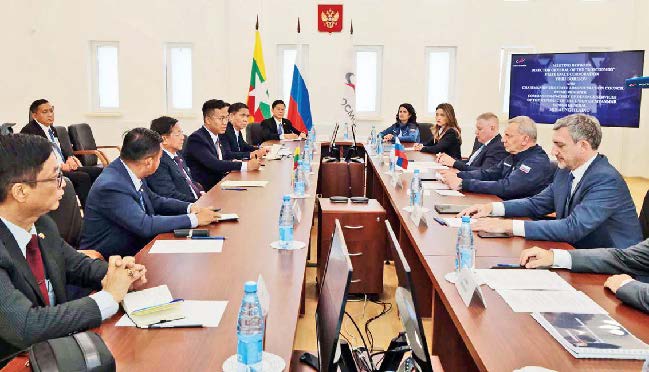 ဆက်လက်ပြီး နိုင်ငံတော်စီမံအုပ်ချုပ်ရေးကောင်စီဥက္ကဋ္ဌ နိုင်ငံတော်ဝန်ကြီးချုပ်နှင့် အဖွဲ့ဝင်များသည် Engineering-technical building(GP-5) သို့ရောက်ရှိကြပြီး ရုရှားနိုင်ငံပိုင် အာကာသကော်ပိုရေးရှင်း State Space Corporation “Roscosmos” ၏ အထွေထွေညွှန်ကြားရေးမှူးချုပ် Mr. Yuri Borisov နှင့် တွေ့ဆုံဆွေးနွေးသည်။