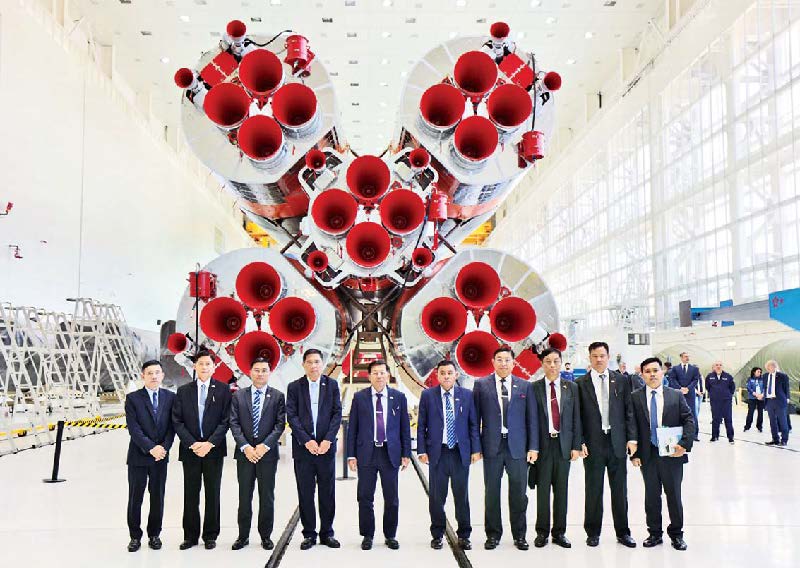 ထို့နောက် Angara ဒုံးပျံပစ်လွှတ်စင် တည်ဆောက်မှုလုပ်ငန်းခွင်နေရာနှင့် Soyuz-2 ဒုံးပျံပစ်လွှတ်စင်နေရာတို့သို့ရောက်ရှိကြပြီး နည်းပညာရပ်ပိုင်းဆိုင်ရာ ဆောင်ရွက်မှု အခြေအနေများနှင့်ပတ်သက်၍ လိုက်လံရှင်းလင်းပြသကြရာ နိုင်ငံတော်စီမံအုပ်ချုပ်ရေးကောင်စီဥက္ကဋ္ဌ နိုင်ငံတော်ဝန်ကြီးချုပ်က သိရှိလိုသည်များအား ပြန်လည်မေးမြန်း ဆွေးနွေးပြောကြားသည်။ ဆက်လက်ပြီး Technical Complex အတွင်းရှိ Rocket တပ်ဆင်ရေးအလုပ်ရုံနှင့် ဂြိုလ်တုထုတ်လုပ်ရေးအလုပ်ရုံအတွင်း လိုက်လံရှင်းလင်းပြသကြရာ နိုင်ငံတော်စီမံအုပ်ချုပ်ရေးကောင်စီဥက္ကဋ္ဌ နိုင်ငံတော်ဝန်ကြီးချုပ်က စိတ်ပါဝင်စားစွာဖြင့် အလုပ်ရုံတစ်ခုချင်းစီအလိုက် သိရှိလိုသည်များအား ပြန်လည်မေးမြန်းဆွေးနွေးခဲ့ပြီး Rocket တပ်ဆင်ရေးအလုပ်ရုံအတွင်းရှိ Soyuz-2 ဒုံးပျံရှေ့တွင် အမှတ်တရ စုပေါင်းဓာတ်ပုံရိုက်ခဲ့ကြသည်။
