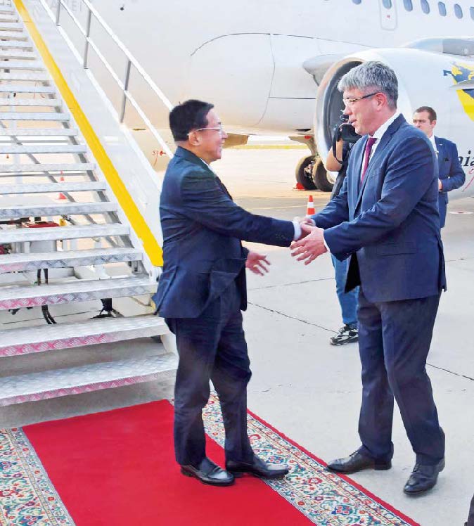 နိုင်ငံတော်စီမံအုပ်ချုပ်ရေးကောင်စီဥက္ကဋ္ဌ နိုင်ငံတော်ဝန်ကြီးချုပ် ဗိုလ်ချုပ်မှူးကြီး မင်းအောင်လှိုင် ဦးဆောင်သည့် မြန်မာအဆင့်မြင့်ကိုယ်စားလှယ်အဖွဲ့သည် ယနေ့မွန်းလွဲပိုင်းတွင် ရုရှားဖက်ဒရေးရှင်းနိုင်ငံ၊ Amur ပြည်နယ်၊ Blagoveshchensk မြို့၊ Ignatyevo အပြည်ပြည်ဆိုင်ရာလေဆိပ်မှတစ်ဆင့် Republic of Buryatia ပြည်နယ်၊ Ulan-Ude မြို့၊ Baikal လေဆိပ်သို့ရောက်ရှိကြရာ Republic of Buryatia ပြည်နယ်အစိုးရအဖွဲ့အကြီးအကဲ Aleksey Sambuyevich Tsydenov နှင့် တာဝန်ရှိသူများက ကြိုဆိုနှုတ်ဆက်ကြသည်။