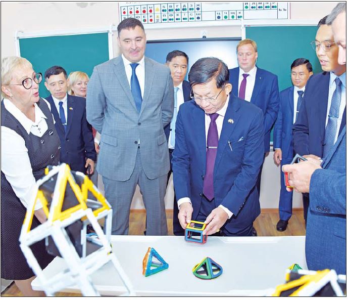 ဆက်လက်ပြီး နိုင်ငံတော်စီမံအုပ်ချုပ်ရေးကောင်စီဥက္ကဋ္ဌ နိုင်ငံတော်ဝန်ကြီးချုပ်နှင့် အဖွဲ့ဝင်များသည် အမှတ်(၁၄) အခြေခံပညာအလယ်တန်းကျောင်း MBOU Zakharovkaya Secondary School Moscow သို့ ရောက်ရှိကြရာ Irkutsk ပြည်နယ်အစိုးရအဖွဲ့ ပညာရေးဝန်ကြီး Maxim Alexandrovich Parfenov၊ ကျောင်းအုပ်ကြီး Ms. Lyudmila Leonidovna Tuchkova နှင့် ကျောင်းတာဝန်ခံများက ကြိုဆိုနှုတ်ဆက်ကြသည်။ ထို့နောက် အမှတ်(၁၄) အခြေခံပညာအလယ်တန်းကျောင်း မူလတန်းကျောင်းသူ၊ ကျောင်းသားများကို ပညာသင်ကြားပေးနေမှုစနစ်များ၊ အဆင့်မြင့်သင်ကြားမှု၊ သင်ယူမှု အထောက်အကူပြု နည်းပညာသုံး၍ ကလေးငယ်များကို စိတ်ပါဝင်စားစေပြီး လွယ်ကူရှင်းလင်းစွာဖြင့် ဘာသာရပ်ပိုင်းဆိုင်ရာများကို နားလည်တတ်ကျွမ်းမှုရှိအောင် သင်ကြားပေးနေသည့် အခြေအနေများ၊ စာကြည့်တိုက်များ၊ ကလေးအားကစားကွင်းများကို စိတ်ပါဝင်စားစွာဖြင့် လိုက်လံကြည့်ရှု လေ့လာခဲ့ကြရာ ကျောင်းအုပ်ကြီးက ရှင်းလင်းပြသသည်။ ရှင်းလင်းတင်ပြမှုများအပေါ် နိုင်ငံတော်စီမံအုပ်ချုပ်ရေးကောင်စီဥက္ကဋ္ဌ နိုင်ငံတော်ဝန်ကြီးချုပ်က ပညာရည်အဆင့်မြှင့်တင်ရေးဆိုင်ရာများတွင် ပူးပေါင်းဆောင်ရွက်နိုင်မည့် အခြေအနေများနှင့် အခြား သိရှိလိုသည်များကို ပြန်လည်မေးမြန်းဆွေးနွေးသည်။