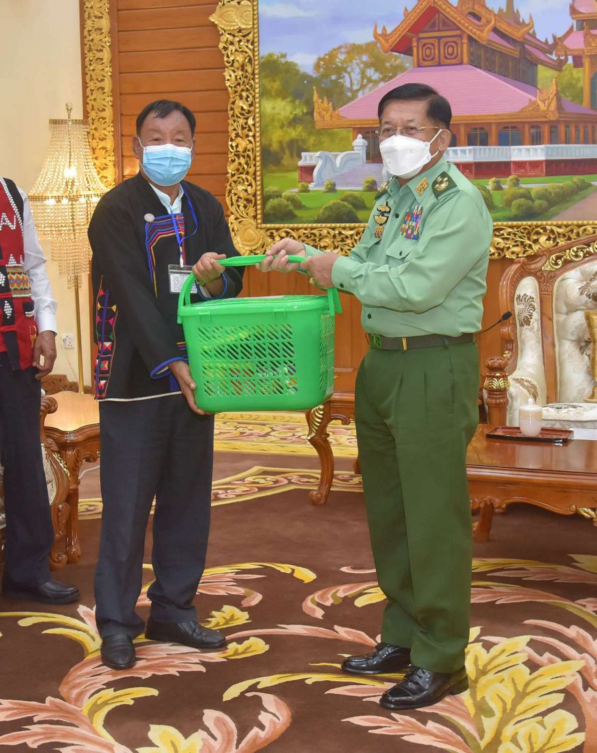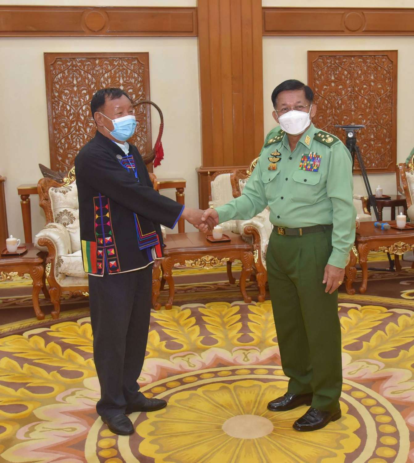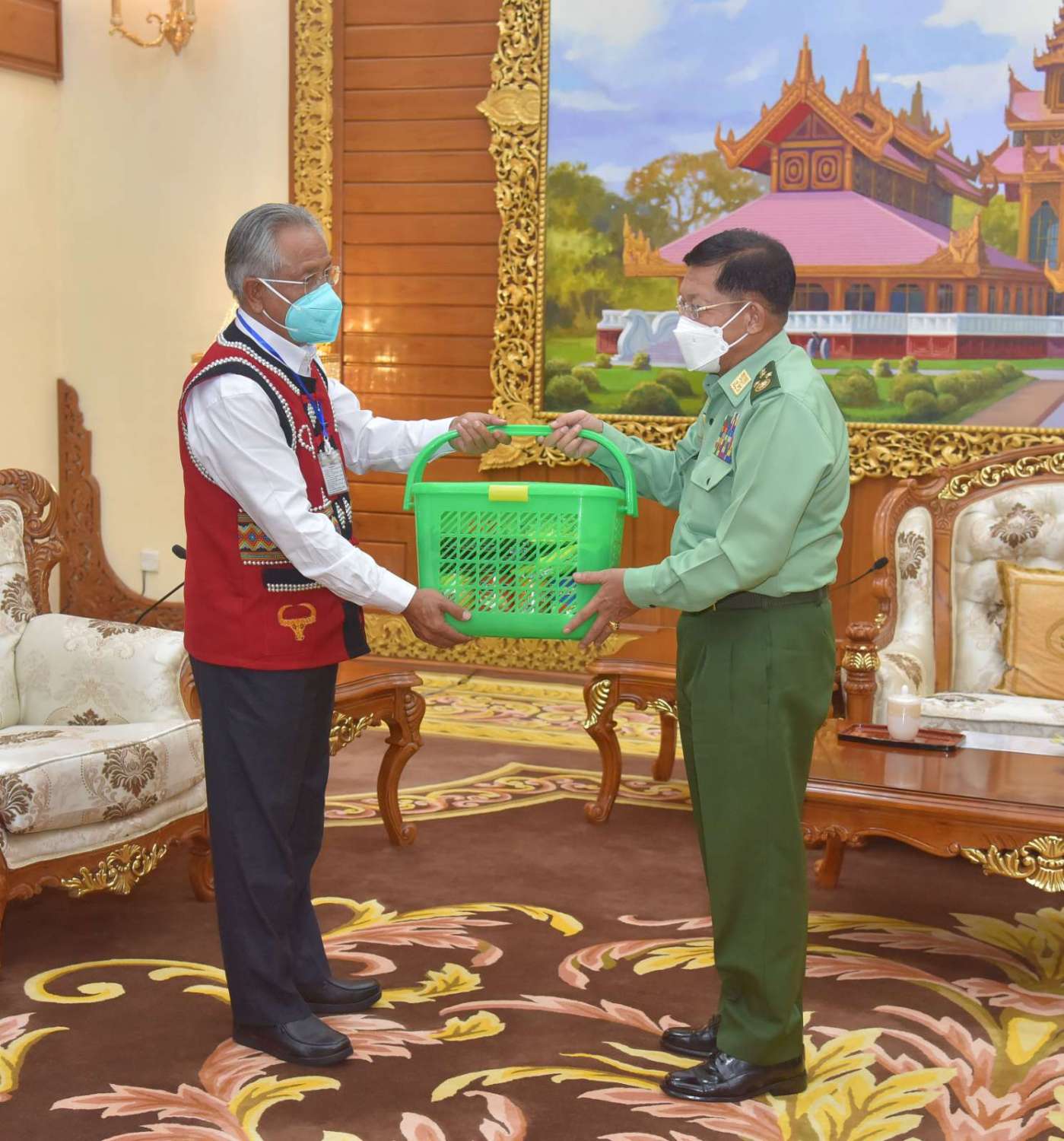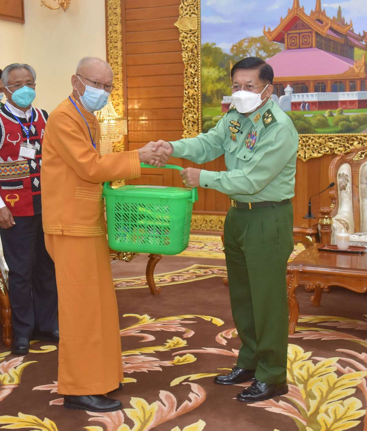 တွေ့ဆုံပွဲအပြီးတွင် နိုင်ငံတော်စီမံအုပ်ချုပ်ရေးကောင်စီဥက္ကဋ္ဌ တပ်မတော်ကာကွယ်ရေးဦးစီးချုပ် က အမှတ်တရလက်ဆောင်ပစ္စည်းများ ပေးအပ်ရာ တက်ရောက်လာကြသည့် ငြိမ်းချမ်းရေးကိုယ်စားလှယ်များ က လက်ခံရယူကြပြီး ဒေသထွက်လက်ဆောင်ပစ္စည်းများကို ပြန်လည်ပေးအပ်ခဲ့ကာ ရင်းရင်းနှီးနှီး ဆွေးနွေးပြောကြားခဲ့ပြီး အမှတ်တရစုပေါင်း ဓာတ်ပုံရိုက်ကြသည်။