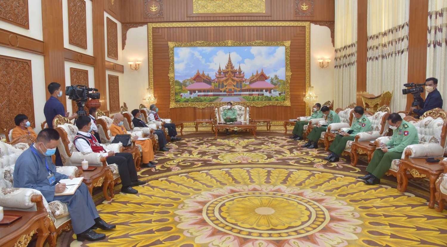 နိုင်ငံတော်စီမံအုပ်ချုပ်ရေးကောင်စီဥက္ကဋ္ဌ တပ်မတော်ကာကွယ်ရေးဦးစီးချုပ် ဗိုလ်ချုပ်မှူးကြီး မင်းအောင်လှိုင်သည်ပြည် သွေးစည်းညီညွတ်ရေးပါတီ (UWSP) ဒုတိယဥက္ကဋ္ဌ ဦးလော့ယာကု၊ အမျိုးသားဒီမိုကရက်တစ်မဟာမိတ်အဖွဲ့ (NDAA) ဒုတိယဥက္ကဋ္ဌ ဦးစန်ပေ့နှင့် ရှမ်းပြည်တိုးတက်ရေးပါတီ (SSPP) ဒုတိယဥက္ကဋ္ဌ() စဝ်ခွန်ဆိုင်တို့ ဦးဆောင်သည့် ငြိမ်းချမ်းရေးကိုယ်စားလှယ်အဖွဲ့အား ယနေ့နံနက်ပိုင်းတွင် နေပြည်တော်ရှိ ဘုရင့်နောင်ရိပ်သာ ဧည့်ခန်းမဆောင်၌ တွေ့ဆုံ၍ ငြိမ်းချမ်းရေးဆိုင်ရာကိစ္စရပ်များ ဆွေးနွေးသည်။