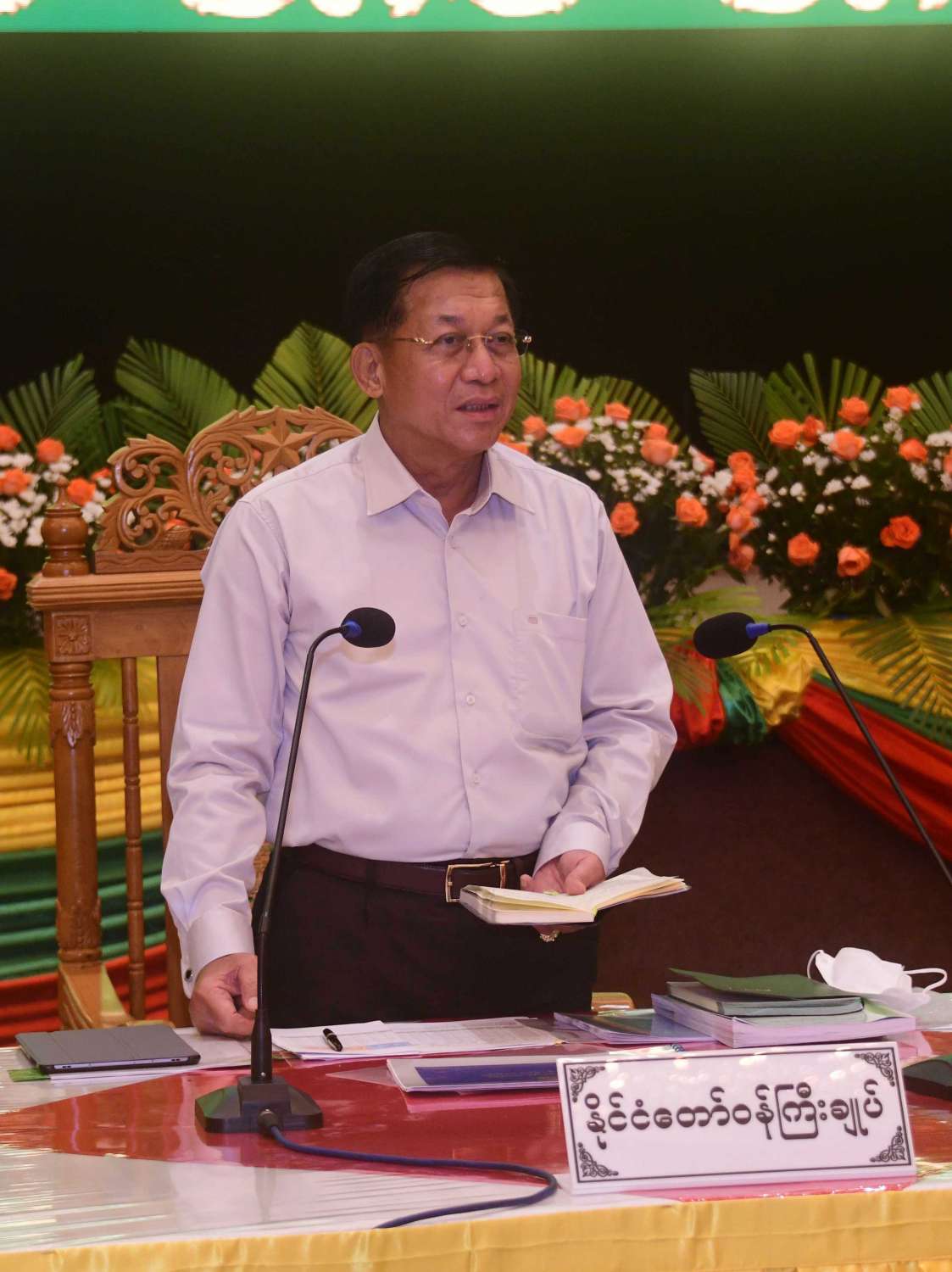 ယင်းနောက် နိုင်ငံတော် စီမံအုပ်ချုပ်ရေးကောင်စီ ဥက္ကဋ္ဌ နိုင်ငံတော်ဝန်ကြီးချုပ် က လုပ်ငန်းရှင်များ၏ တင်ပြချက်များနှင့် အသေးစား၊ အငယ်စားနှင့် အလတ်စား စီးပွားရေး လုပ်ငန်းများ ဖွံ့ဖြိုးတိုးတက်ရေး အတွက် ပြန်လည်ဆွေးနွေး ပြောကြားရာတွင် မန္တလေးတိုင်း ဒေသကြီးအတွင်းရှိ MSME လုပ်ငန်းများ တိုးတက်ရေးအတွက် တွေ့ဆုံခဲ့ခြင်း ဖြစ်ကြောင်း၊ တိုင်းပြည်သာယာ ဝပြောရေးနှင့် စားရေရိက္ခာ ပေါများရေးကို အမျိုးသားရေး ရည်မှန်းချက်အဖြစ် ဆောင်ရွက်ရမည် ဖြစ်ပြီး လုပ်ကိုင်ဆောင်ရွက် နေသူများအားလုံး အေးချမ်း လုံခြုံစွာဖြင့် လုပ်ကိုင်နေထိုင် ဆောင်ရွက်နေခြင်းသည် တိုင်းပြည်သာယာ ဝပြောခြင်းဖြစ်ကြောင်း၊ စားရေရိက္ခာ ပေါများရေးနှင့် ပတ်သက်၍ သောက်သုံးရေ လုံလောက်စွာ ရရှိရေးနှင့် စားသောက်ဖွယ်ရာ များသာမက တစ်ကိုယ်ရေသုံး ပစ္စည်းများသည်လည်း ရိက္ခာတွင် ပါဝင်ကြောင်း၊ တိုင်းပြည်သာယာ ဝပြောရေးနှင့် စားရေရိက္ခာ ပေါများရေးအတွက် နိုင်ငံအတွင်း နေထိုင်သူများက ဆောင်ရွက်ရခြင်း ဖြစ်ပြီး ပြည်တွင်းအလုပ် အကိုင်အခွင့်အလမ်း ပေါများရေးနှင့် ပြည်တွင်းစီးပွားရေး ကောင်းမွန်စေရေး ဆောင်ရွက်ရမည် ဖြစ်ကြောင်း၊ ကုန်ကြမ်းများ ပေါများရေး၊ သွင်းအားစုများ လုံလောက်စွာ ရရှိရေး၊ အရင်းအနှီးများ ရရှိရေးနှင့် လူသား အရင်းအမြစ်များ လုံလောက်စွာ ရရှိရန် လိုကြောင်း။