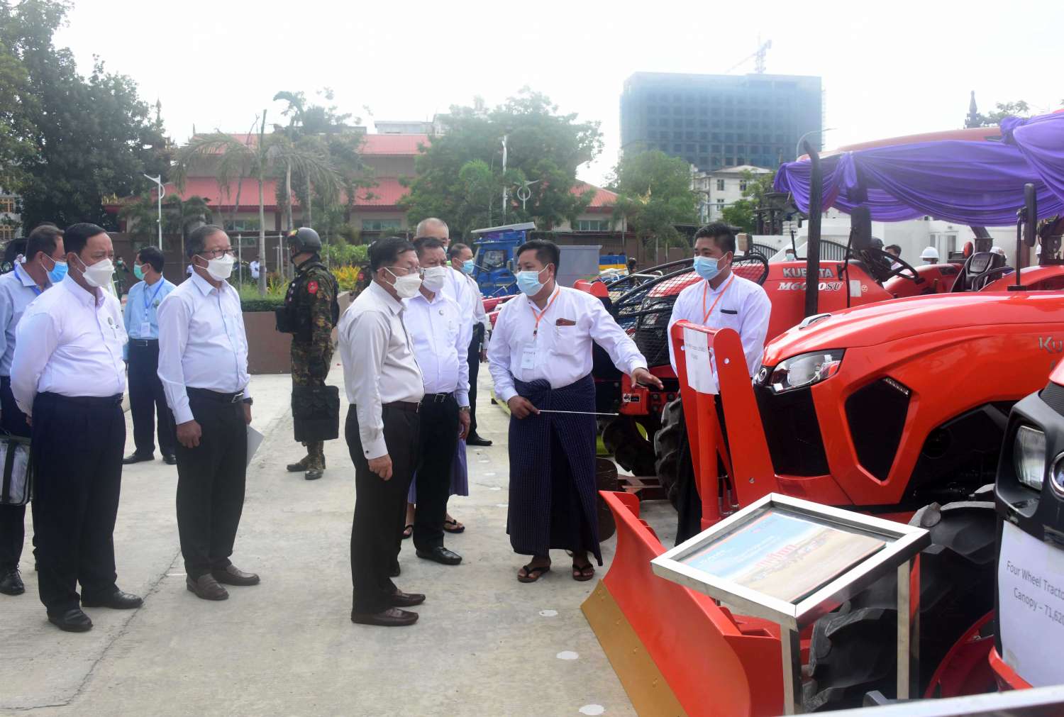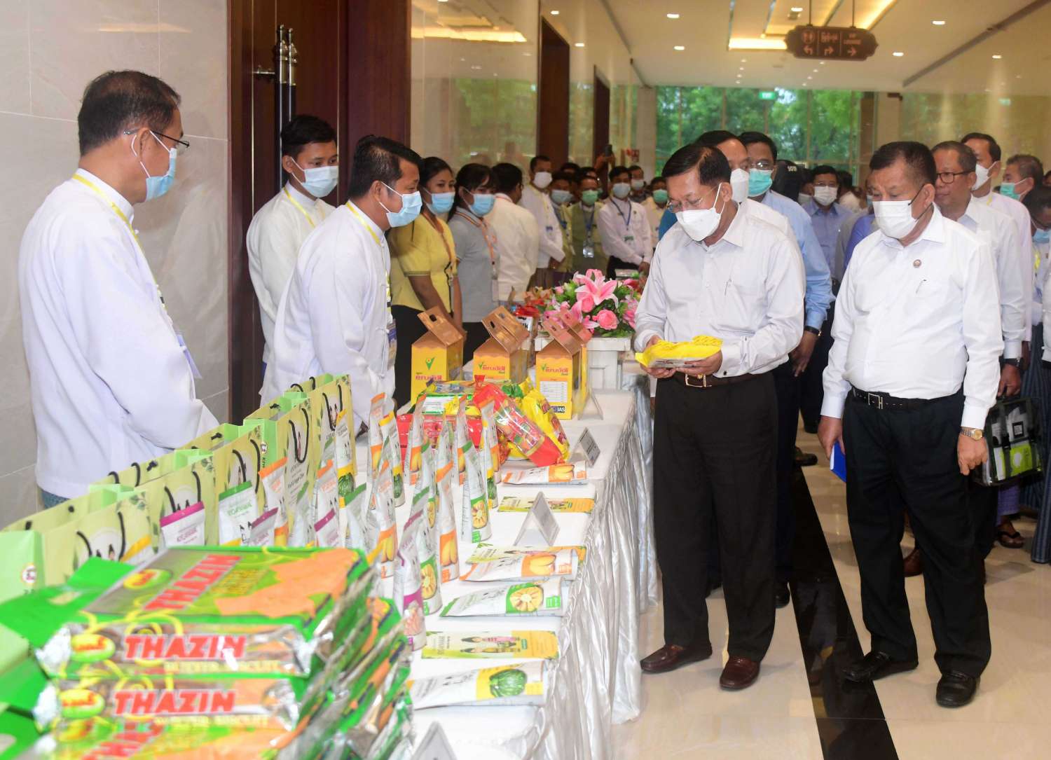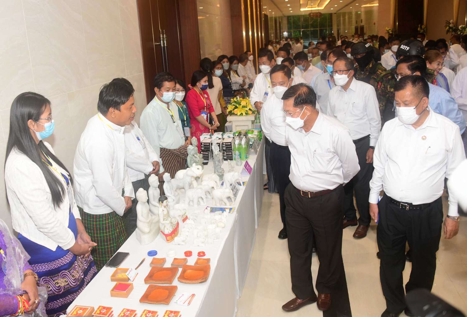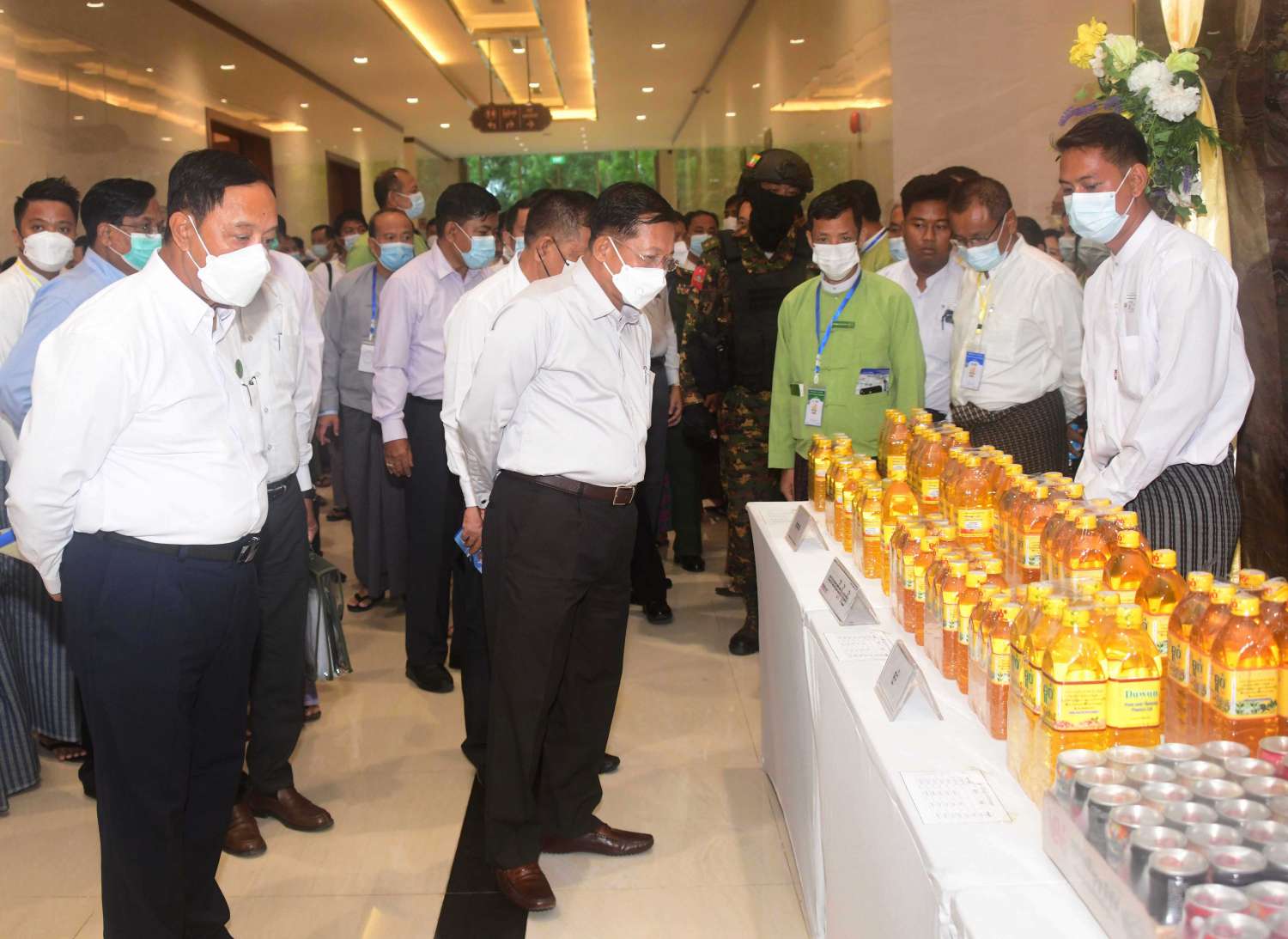 ထို့နောက် နိုင်ငံတော် စီမံအုပ်ချုပ်ရေးကောင်စီ ဥက္ကဋ္ဌ နိုင်ငံတော် ဝန်ကြီးချုပ်သည် မန္တလေး စက်မှုဇုန်အတွင်းမှ ထုတ်လုပ်ထားသည့် စားသောက်ကုန်၊ လူသုံးကုန်၊ စက်မှု လက်မှုထုတ်ကုန်၊ တိုင်းရင်းဆေး စသည့် ထုတ်ကုန်ပစ္စည်းများ၊ လယ်ယာ စိုက်ပျိုးရေး လုပ်ငန်းသုံး ယာဉ်များ ခင်းကျင်း ပြသထားရှိမှုများကို ပြကွက် တစ်ခုချင်းစီအလိုက် စိတ်ဝင်တစားဖြင့် လေ့လာခဲ့ပြီး ဈေးကွက်ရရှိမှု အခြေအနေများကို မေးမြန်း ဆွေးနွေးရာ လုပ်ငန်းအလိုက် တာဝန်ခံများက လိုက်လံ ရှင်းလင်း ပြသကြသည်။
