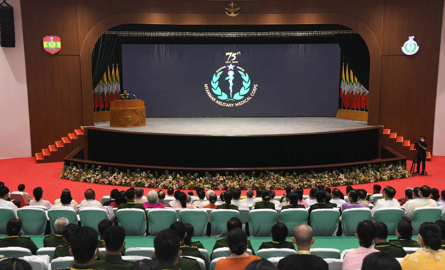 ထို့နောက် ဘွဲ့နှင်းသဘင်ခန်းမအတွင်း၌ (၇၅)နှစ်မြောက် စိန်ရတုဆေးဝန်ထမ်းတပ်ဖွဲ့နေ့ အထိမ်းအမှတ်အဖြစ် နိုင်ငံတော်စီမံအုပ်ချုပ်ရေးကောင်စီဥက္ကဋ္ဌ တပ်မတော်ကာကွယ်ရေးဦးစီးချုပ်က ဂုဏ်ပြုအမှာစကား ပြောကြားရာတွင် ယနေ့သည် လွတ်လပ်ရေး ကြိုးပမ်းမှုကာလကတည်းက မြန်မာ့တပ်မတော်နှင့်အတူ ပေါက်ဖွားလာခဲ့ပြီး သမိုင်းအစဉ်အလာကြီးမားစွာ ရပ်တည်လာခဲ့သည့် တပ်မတော်ဆေးဝန်ထမ်းတပ်ဖွဲ့၏ (၇၅)နှစ်မြောက် စိန်ရတုဆေးဝန်ထမ်းတပ်ဖွဲ့နေ့ အခမ်းအနားဖြစ်ကြောင်း၊  စိန်ရတုတိုင်အောင် ခေတ်အဆက်ဆက် ကောင်းမြတ်သည့် အစဉ်အလာများကို လက်ဆင့်ကမ်း ထိန်းသိမ်းလာသည့် ဆေးဝန်ထမ်းတပ်ဖွဲ့အတွက် အလွန်ဂုဏ်ယူဖွယ်ရာ နေ့ထူး၊ နေ့မြတ်ဖြစ်သည်ဟု ဦးစွာ ပြောကြားလိုကြောင်း။