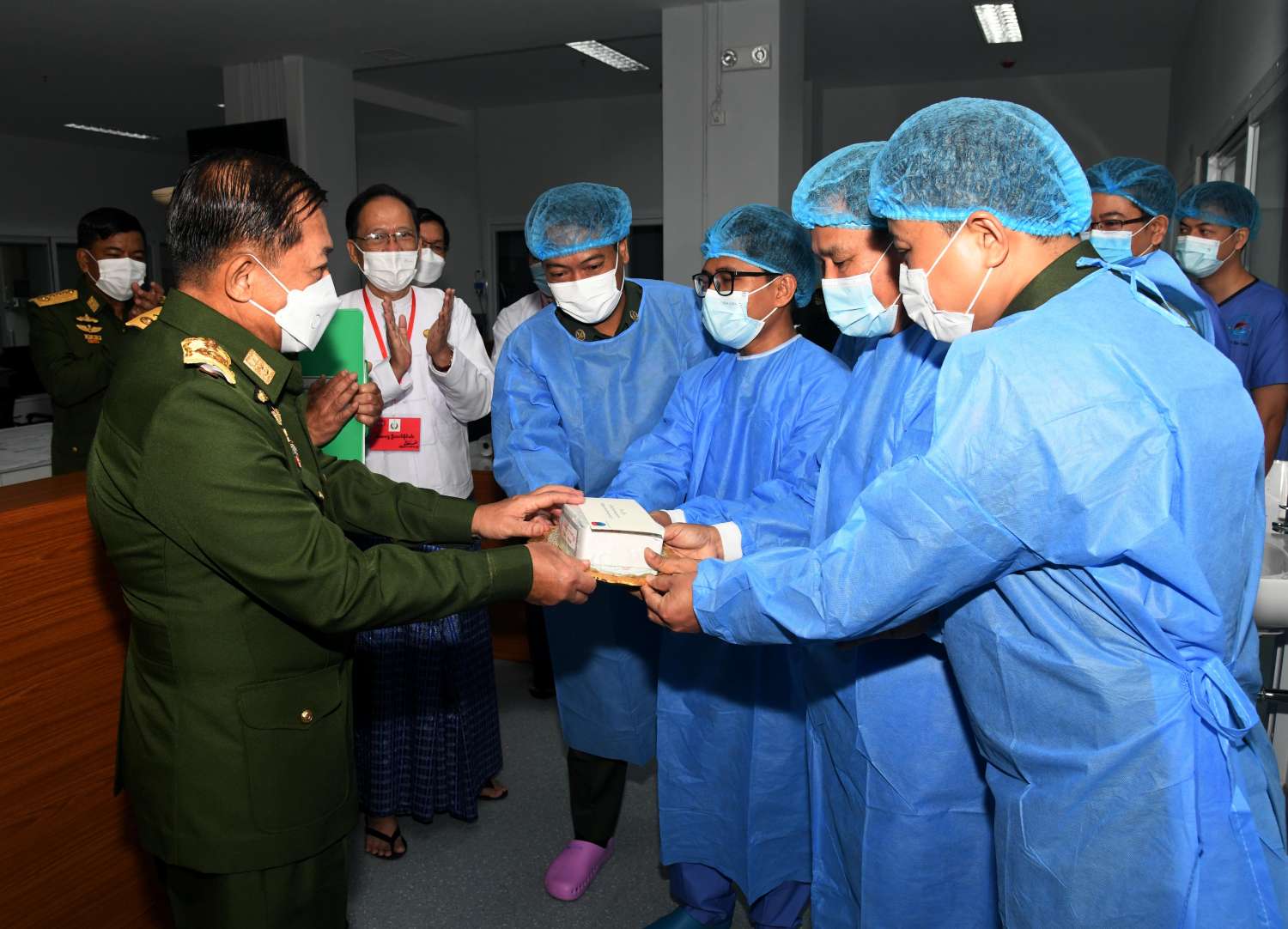 တပ်မတော် ဆေးရုံ/ ဆေးတပ် ၆၇ ခုနှင့် ကိုဗစ်ကုသမှုစင်တာ ၅၄ ခုတို့ကို ဖွင့်လှစ်ပြီး ပြည်သူလူထုကိုလည်း ကုသမှုများပေးနိုင်ခဲ့သည်ကို တွေ့ရှိရပါကြောင်း၊ ထိုသို့ကုသပေးခဲ့ရာတွင် ၂၀၂၂ ခုနှစ်၊ စက်တင်ဘာလ ၁၅ ရက်နေ့အထိ ကိုဗစ်အတည်ပြုလူနာ သံဃာတော် ၁,၅၀၅ ဦး၊ သီလရှင် ၁၀၈ ဦး၊ အရပ်သား ၁၆,၀၅၄ ဦး နှင့် နိုင်ငံခြားသား ၁၃၅ ဦး၊ စုစုပေါင်း ၁၇,၈၀၂ ဦးကို ပြုစုစောင့်ရှောက်မှုပေးနိုင်ခဲ့သည်ကို တွေ့ရမည်ဖြစ်ကြောင်း၊ ကျန်းမာရေးဝန်ကြီးဌာနနှင့် အခြားဝန်ကြီးဌာနများ၏ လိုအပ်ချက်အရ ဆေးဝန်ထမ်းတပ်ဖွဲ့ဝင်များကို လွှဲပြောင်းတာဝန်ပေးနိုင်ခဲ့သည်ကိုလည်း ဂုဏ်ယူဝမ်းမြောက်ဖွယ်ရာ တွေ့ရှိရပါကြောင်း။