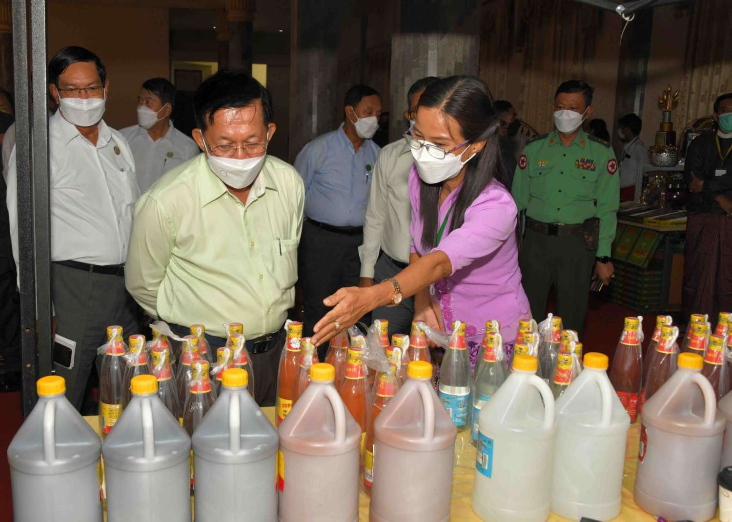 ထို့နောက် နိုင်ငံတော်စီမံအုပ်ချုပ်ရေးကောင်စီဥက္ကဋ္ဌ နိုင်ငံတော်ဝန်ကြီးချုပ်သည် ခင်းကျင်းပြသထားသည့် အသေးစား၊ အငယ်စားနှင့် အလတ်စား စီးပွားရေး (MSME) လုပ်ငန်းရှင်များ၏ လှုပ်ရှားမှုမှတ်တမ်းဓာတ်ပုံများ၊ စားသောက်ကုန်၊ လူသုံးကုန်၊ စက်မှုလက်မှုထုတ်ကုန်၊ မြန်မာ့ရိုးရာလက်မှုထုတ်ကုန်များ၊ ကျောက်မျက်ရတနာ ထုတ်ကုန်များ၊ အဝတ်အထည်များ၊ တိုင်းရင်းဆေးများ စသည့်ထုတ်ကုန်ပစ္စည်းများ ခင်းကျင်းပြသထားရှိမှုများကို ပြကွက်တစ်ခုချင်းစီအလိုက် စိတ်ဝင်တစားဖြင့် လေ့လာခဲ့ပြီး ဈေးကွက်ရရှိမှုအခြေအနေများကို မေးမြန်းဆွေးနွေးရာ လုပ်ငန်းအလိုက် တာဝန်ခံများက လိုက်လံ ရှင်းလင်းတင်ပြခဲ့ကြကြောင်း သတင်းရရှိသည်။