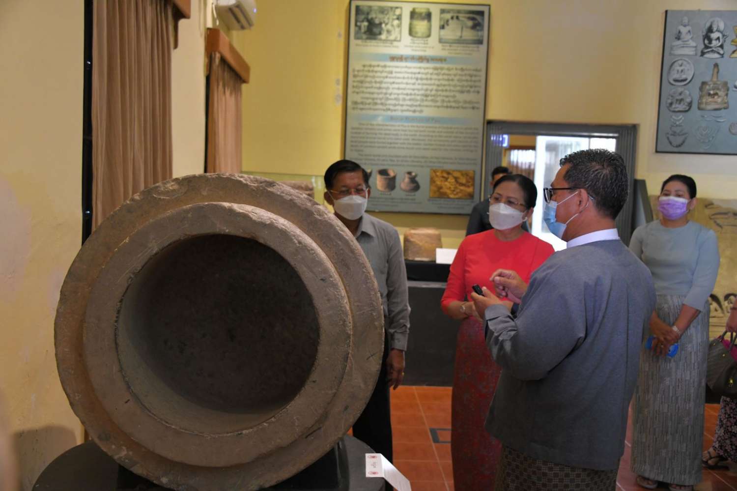 ထို့နောက် နိုင်ငံတော်စီမံအုပ်ချုပ်ရေးကောင်စီဥက္ကဋ္ဌ နိုင်ငံတော်ဝန်ကြီးချုပ်၊ ဇနီးနှင့် အဖွဲ့ဝင်များသည် သရေခေတ္တရာ ယဉ်ကျေးမှုဇုန်အတွင်းရှိ သီရိခေတ္တရာပြတိုက်အတွင်း ခင်းကျင်းပြသထားသည့် အဆင်တန်ဆာနှင့် အသုံးအဆောင်များဆိုင်ရာ ပြခန်း၊ စာပေနှင့် ကိုးကွယ်ယုံကြည်မှုဆိုင်ရာပြခန်း၊ ရှေးခေတ်အသုံးအဆောင် ပစ္စည်းများ၊ စာပေဆိုင်ရာ အထောက်အထားများ၊ ပျူခေတ်အုတ်များ၊ ဗိသုကာလက်ရာများနှင့် ပျူခေတ် အသုံးအဆောင်ပစ္စည်းများ စသည့် ပြကွက်များကို တစ်ခုချင်းအသေးစိတ် စိတ်ဝင်တစား ကြည့်ရှုလေ့လာခဲ့ပြီး တာဝန်ရှိသူများ၏ တင်ပြချက်များအပေါ် သမိုင်းအထောက်အထားများအား စနစ်တကျ ထိန်းသိမ်းထားရှိရန်၊ ပြတိုက်အတွင်း ခင်းကျင်းပြသထားသည့် ဓာတ်ပုံများနှင့် ခုနှစ်၊ သက္ကရာဇ်များ၊ တူးဖော်ရရှိသည့် နေရာများကို အလွယ်တကူ လေ့လာသိရှိနိုင်ရေးအတွက်လည်း ရှင်းလင်းစွာ စာတန်းထိုးထားရန်လိုကြောင်း၊ ပျူစာဖြင့် ရေးထိုးထားသည့် ကျောက်စာများကို သမိုင်းပညာရှင်များဖြင့် ဘာသာပြန်ဆို၍ အများပြည်သူလေ့လာနိုင်ရေး ထားရှိရန်လိုကြောင်း၊ ရှေးခေတ်လက်ရာ ဒင်္ဂါးပြားများ၊ လက်ဝတ်ရတနာများကို အနီးကပ်ကြည့်ရှုလေ့လာနိုင်ရေး ခေတ်မီနည်းစနစ်များ အသုံးပြု၍ LED Screen များဖြင့် လေ့လာကြည့်ရှုနိုင်အောင် ဆောင်ရွက်ပေးထားရန်လိုကြောင်း၊ Digital Museum အဖြစ် အဆင့်မြှင့်တင်နိုင်ရေး ဆောင်ရွက်ရန်နှင့် အခြားလိုအပ်သည်များကို မှာကြားသည်။