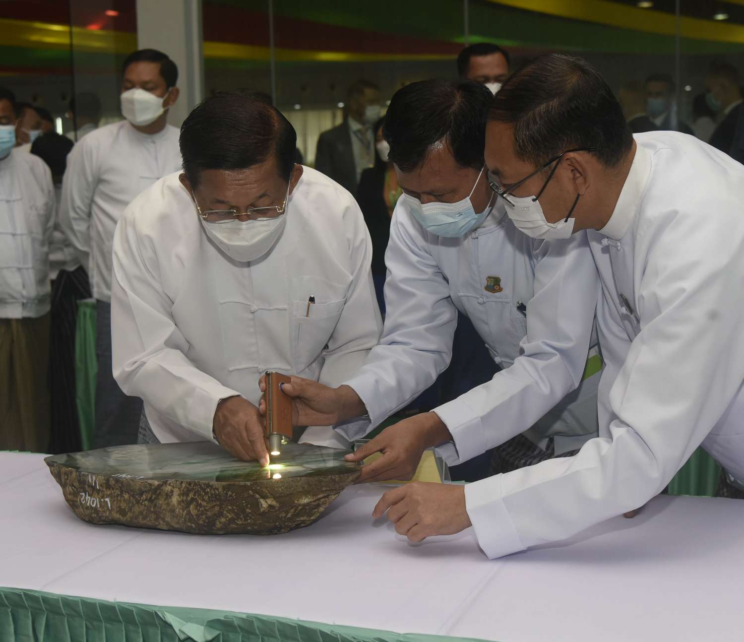 ယင်းနောက် နိုင်ငံတော် စီမံအုပ်ချုပ်ရေးကောင်စီ ဥက္ကဋ္ဌ နိုင်ငံတော် ဝန်ကြီးချုပ်နှင့် အခမ်းအနား တက်ရောက်လာကြသူများသည် ၂၀၂၂ ခုနှစ်၊ နှစ်လယ် မြန်မာ့ကျောက်မျက်ရတနာပြပွဲ၌ ရောင်းချရန် မဏိရတနာ ကျောက်စိမ်းခန်းမအတွင်း ပြသထားသော ကျောက်စိမ်း၊ ကျောက်မျက်အတွဲများနှင့် ပုလဲအတွဲများ၊ ခန်းမအပြင်ဘက်တွင် ခင်းကျင်းပြသထားသည့် ကျောက်စိမ်းရိုင်း အတွဲများကို လိုက်လံကြည့်ရှုစစ်ဆေးပြီး တာဝန်ရှိသူများက ရှင်းလင်း တင်ပြမှုအပေါ် နိုင်ငံတော် စီမံအုပ်ချုပ်ရေးကောင်စီ ဥက္ကဋ္ဌ နိုင်ငံတော် ဝန်ကြီးချုပ်က လိုအပ်သည်များ လမ်းညွှန်မှာကြားသည်။