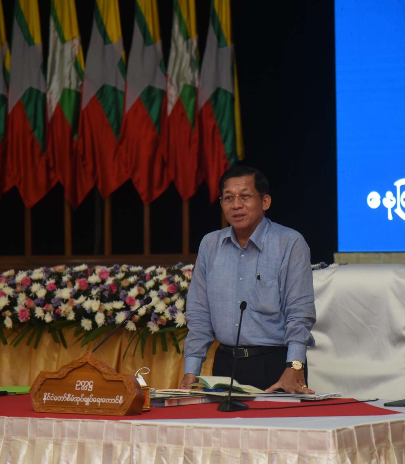 နိုင်ငံတော်စီမံအုပ်ချုပ်ရေးကောင်စီဥက္ကဋ္ဌ နိုင်ငံတော်ဝန်ကြီးချုပ် ဗိုလ်ချုပ်မှူးကြီးမင်းအောင်လှိုင်သည် ယနေ့မွန်းလွဲပိုင်းတွင် နေပြည်တော်ကောင်စီနယ်မြေအတွင်းရှိ အသေးစား၊ အငယ်စားနှင့်အလတ်စားစီးပွားရေး (MSME) လုပ်ငန်းရှင်များအား နေပြည်တော်ကောင်စီရုံးဝင်းရှိ ဇမ္ဗူသီရိခန်းမ၌တွေ့ဆုံ၍ ဒေသတွင်းစီးပွားရေး လုပ်ငန်းများ ဖွံ့ဖြိုးတိုးတက်ရေးအတွက် ဆွေးနွေးပြောကြားသည်။