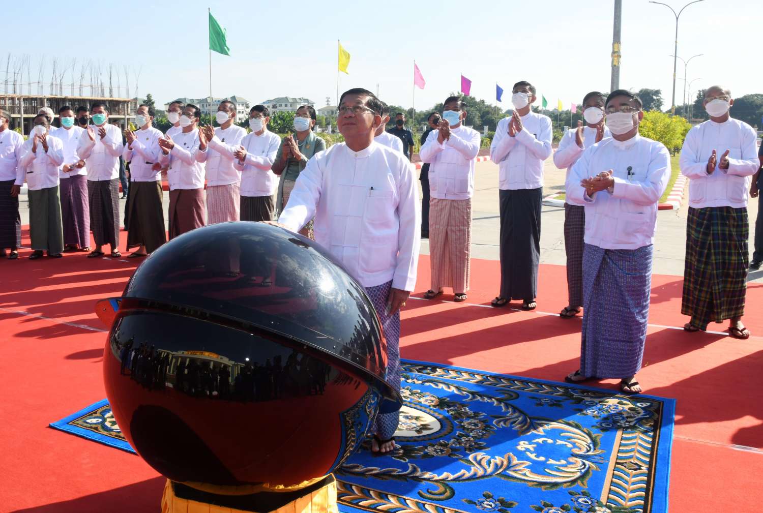 ထို့နောက် နိုင်ငံတော်စီမံအုပ်ချုပ်ရေးကောင်စီ ဒုတိယဥက္ကဋ္ဌ ဒုတိယဝန်ကြီးချုပ်နှင့် အခမ်းအနား တက်ရောက်လာကြသူများသည် Naypyitaw State Academy ကမ္ပည်းမော်ကွန်းကို အမွှေးနံ့သာရည်များပက်ဖျန်းပေးကြသည်။