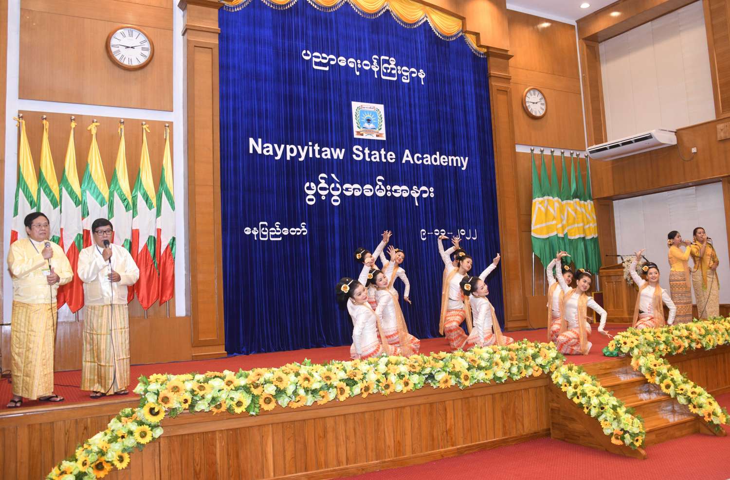 ယင်းနောက် ပထမထပ်ရှိ Function Hall အတွင်း Naypyitaw State Academy ဖွင့်ပွဲအထိမ်းအမှတ်အခမ်းအနားကို ဆက်လက်ကျင်းပရာ ယဉ်ကျေးမှုတက္ကသိုလ်မှ ဆရာမများ၊ ကျောင်းသူများနှင့် အနုပညာရှင်များက Naypyitaw State Academy အဖွင့်သီချင်းဖြင့် သီဆိုကပြဖျော်ဖြေကြသည်။