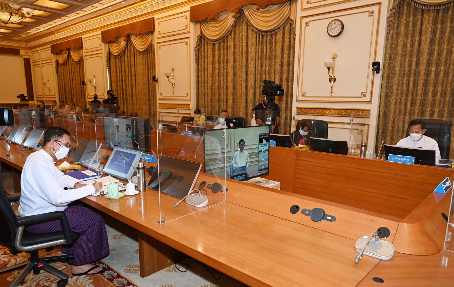 အစည်းအဝေးသို့ ဘဏ္ဍာရေးဆိုင်ရာကော်မရှင် ဒုတိယဥက္ကဋ္ဌ နိုင်ငံတော်စီမံအုပ်ချုပ်ရေးကောင်စီ ဒုတိယဥက္ကဋ္ဌ ဒုတိယဝန်ကြီးချုပ် ဒုတိယဗိုလ်ချုပ်မှူးကြီး စိုးဝင်း၊ ဘဏ္ဍာရေးဆိုင်ရာကော်မရှင် အတွင်းရေးမှူး၊ စီမံကိန်းနှင့်ဘဏ္ဍာရေးဝန်ကြီးဌာန ပြည်ထောင်စုဝန်ကြီး ဦးဝင်းရှိန်၊ ဥပဒေရေးရာဝန်ကြီးဌာန ပြည်ထောင်စုဝန်ကြီး ပြည်ထောင်စုရှေ့နေချုပ် ဒေါက်တာ ဒေါ်သီတာဦး၊ ပြည်ထောင်စုစာရင်းစစ်ချုပ် ဦးတင်ဦးနှင့် ဒုတိယဝန်ကြီး ဦးမောင်မောင်ဝင်း တို့တက်ရောက်ကြပြီး နေပြည်တော်ကောင်စီဥက္ကဋ္ဌ၊ တိုင်းဒေသကြီးနှင့် ပြည်နယ်အစိုးရအဖွဲ့ ဝန်ကြီးချုပ်များက Video Conferencing ဖြင့် တက်ရောက်ကြသည်။