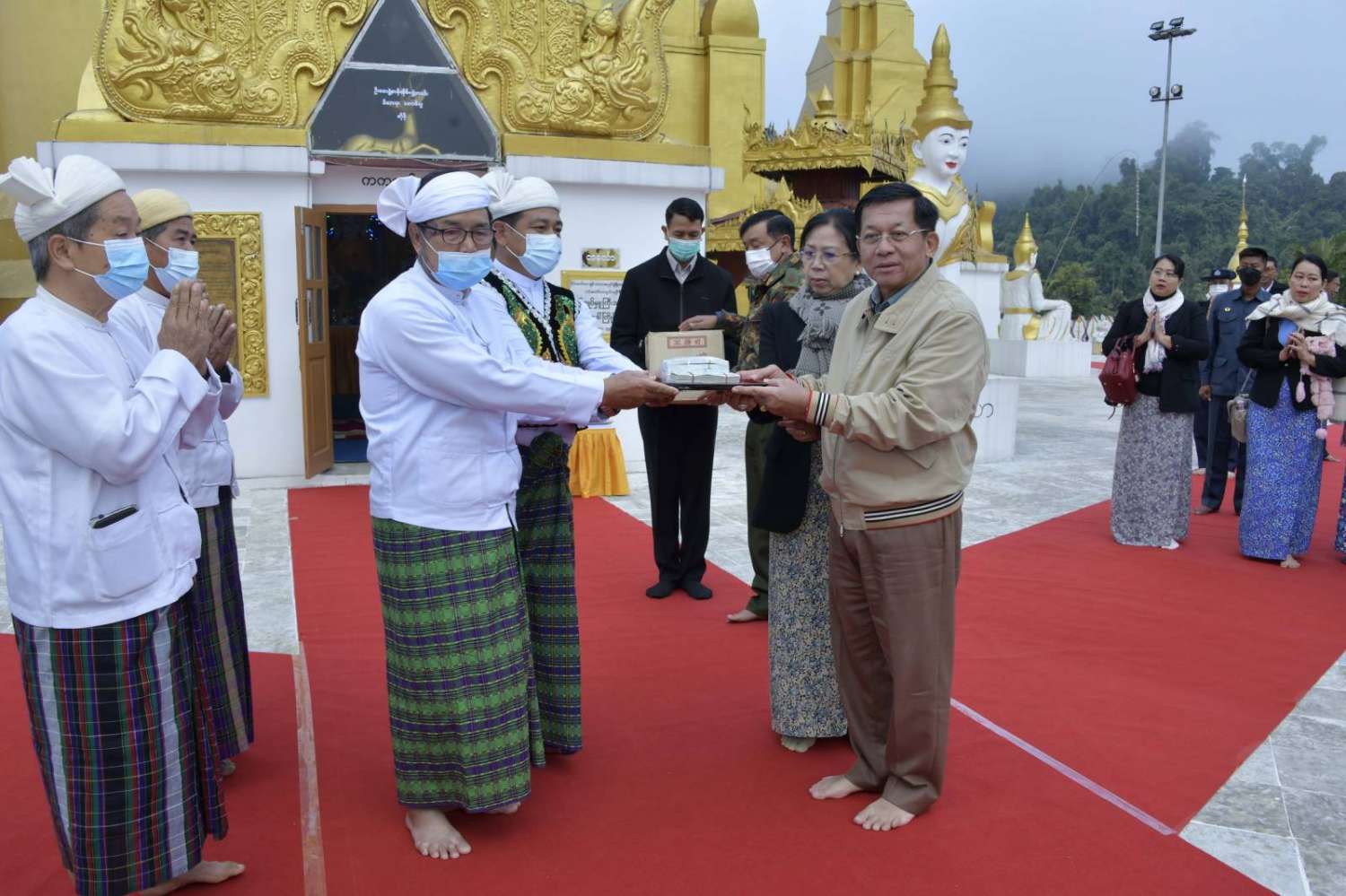 ထို့နောက် နိုင်ငံတော်စီမံအုပ်ချုပ်ရေးကောင်စီဥက္ကဋ္ဌ နိုင်ငံတော်ဝန်ကြီးချုပ်က စေတီတော်မြတ်ကြီး ဧည့်သည်တော်မှတ်တမ်းစာအုပ်တွင် လက်မှတ်ရေးထိုးပြီး စေတီ တော်မြတ်ကြီး ဘက်စုံပြုပြင်ထိန်းသိမ်းရန်အတွက် အလှူငွေများပေးအပ်လှူဒါန်းရာ ဂေါပကအဖွဲ့ဥက္ကဋ္ဌနှင့် အဖွဲ့ဝင်များက လက်ခံရယူကြပြီး ဂုဏ်ပြုမှတ်တမ်းလွာ ပြန်လည် ပေးအပ်သည်။