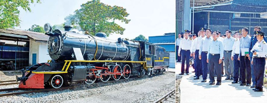 ထို့နောက် နိုင်ငံတော်စီမံအုပ်ချုပ်ရေးကောင်စီဥက္ကဋ္ဌ နိုင်ငံတော်ဝန်ကြီးချုပ်နှင့် အဖွဲ့ဝင်များသည် ရေနွေးငွေ့စက်ခေါင်းအား ကျောက်မီးသွေးသုံးစက်ခေါင်းအဖြစ် ပြုပြင်ထားရှိသည့် မီးရထားစက်ခေါင်းစမ်းသပ်မောင်းနှင်နေမှုအား ကြည့်ရှုသည်။