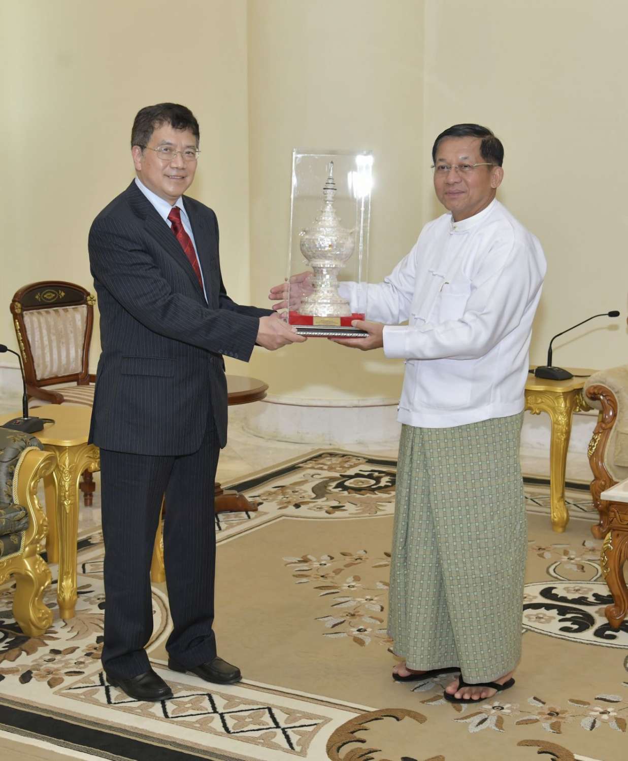 တွေ့ဆုံပွဲအပြီးတွင် နိုင်ငံတော်စီမံအုပ်ချုပ်ရေးကောင်စီဥက္ကဋ္ဌ နိုင်ငံတော်ဝန်ကြီးချုပ်နှင့် တရုတ်နိုင်ငံခြားရေးဝန်ကြီးဌာနမှ သံအမတ်ကြီးတို့သည် အမှတ်တရလက်ဆောင်ပစ္စည်းများ အပြန်အလှန်ပေးအပ်ခဲ့ကြသည်။