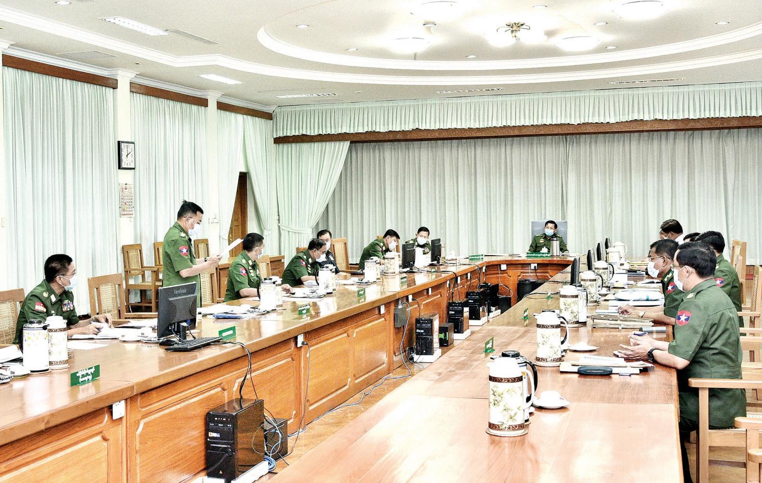 ကမ္ဘာ့ကပ်ရောဂါ ကိုဗစ်-၁၉ ကာကွယ်ရေး၊ ထိန်းချုပ်ရေး၊ ကုသရေးနှင့် အခြားလိုအပ်ချက်များ ဆောင်ရွက် ပေးနိုင်ရေး ဆဋ္ဌမအကြိမ်ညှိနှိုင်းအစည်းအဝေးကို ယနေ့ မွန်းလွဲပိုင်းတွင် နေပြည်တော်ရှိ ကာကွယ်ရေး ဦးစီးချုပ်ရုံး(ကြည်း) အစည်းအဝေးခန်းမ၌ ကျင်းပရာ တပ်မတော် ကာကွယ်ရေးဦးစီးချုပ် ဗိုလ်ချုပ်မှူးကြီး မင်းအောင်လှိုင်၊ ဒုတိယတပ်မတော်ကာကွယ်ရေးဦးစီးချုပ် ကာကွယ်ရေးဦးစီးချုပ် (ကြည်း) ဒုတိယ ဗိုလ်ချုပ်မှူးကြီး စိုးဝင်း၊ ကာကွယ်ရေးဝန်ကြီးဌာန ပြည်ထောင်စုဝန်ကြီး ဒုတိယဗိုလ်ချုပ်ကြီး စိန်ဝင်း၊ ညှိနှိုင်း ကွပ်ကဲ ရေးမှူး (ကြည်း၊ ရေ၊ လေ) ဗိုလ်ချုပ်ကြီး မြထွန်းဦး၊ ကာကွယ်ရေးဦးစီးချုပ်(ရေ) ဗိုလ်ချုပ်ကြီး တင်အောင်စန်း၊ ကာကွယ်ရေးဦးစီးချုပ်(လေ) ဗိုလ်ချုပ်ကြီး မောင်မောင်ကျော် နှင့် တပ်မတော်အရာရှိကြီးများ တက်ရောက်ကြ သည်။