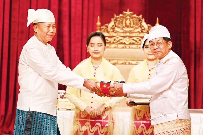 ယင်းနောက် နိုင်ငံတော်စီမံအုပ်ချုပ်ရေးကောင်စီဥက္ကဋ္ဌ နိုင်ငံတော်ဝန်ကြီးချုပ်သည် ၂၀၂၃ ခုနှစ် (၇၅)နှစ်မြောက် စိန်ရတုလွတ်လပ်ရေးနေ့အထိမ်းအမှတ် ဂုဏ်ထူးဆောင်ဘွဲ့များ ချီးမြှင့်အပ်နှင်းခြင်းအခမ်းအနားတွင် တာဝန်ထမ်းဆောင်ခဲ့ကြသည့် ပြည်ထဲရေးဝန်ကြီးဌာနမှဝန်ထမ်းများ၊ ပြန်ကြားရေးဝန်ကြီးဌာနမှဝန်ထမ်းများ၊ သာသနာရေးနှင့်ယဉ်ကျေးမှုဝန်ကြီးဌာနမှဝန်ထမ်းများနှင့် တိုင်းရင်းသားလူငယ်မောင်မယ်များ၊ ကျောင်းသား၊ ကျောင်းသူများနှင့် နိုင်ငံတော်စီမံအုပ်ချုပ်ရေးကောင်စီ အိမ်တော်ဂုဏ်ပြုခန်းမဆောင်အား ပုံစံဒီဇိုင်းရေးဆွဲပေးခဲ့သည့် ဗိသုကာပညာရှင်တို့ကို ဂုဏ်ပြုချီးမြှင့်ငွေများပေးအပ်ခဲ့သည်။